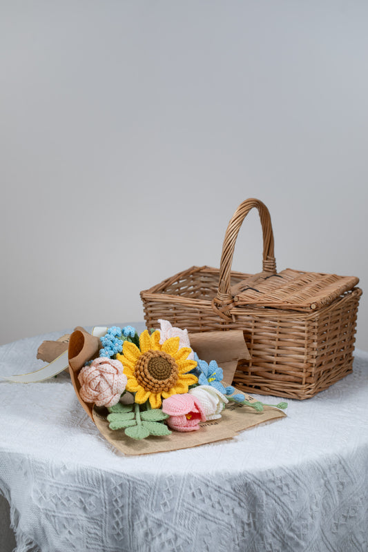 - TaylorThe crochet flowers are beautiful!! The quality is excellent. The way it was carefully done. I had purchased a seperate sunflower to be added to the bouquet I bought and it was perfectly placed together. Love it!