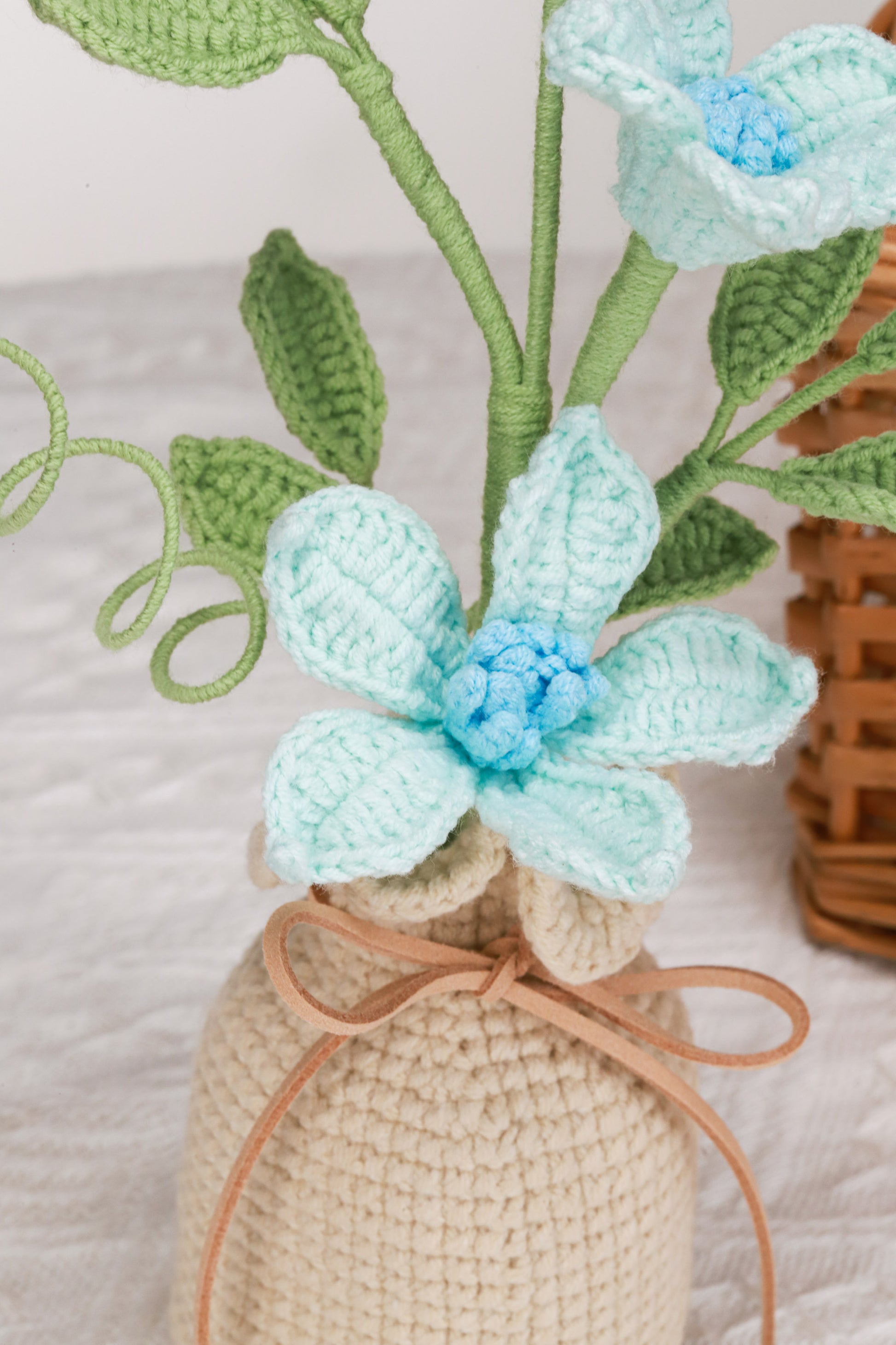 handmade crochet potted plant with blue clematis