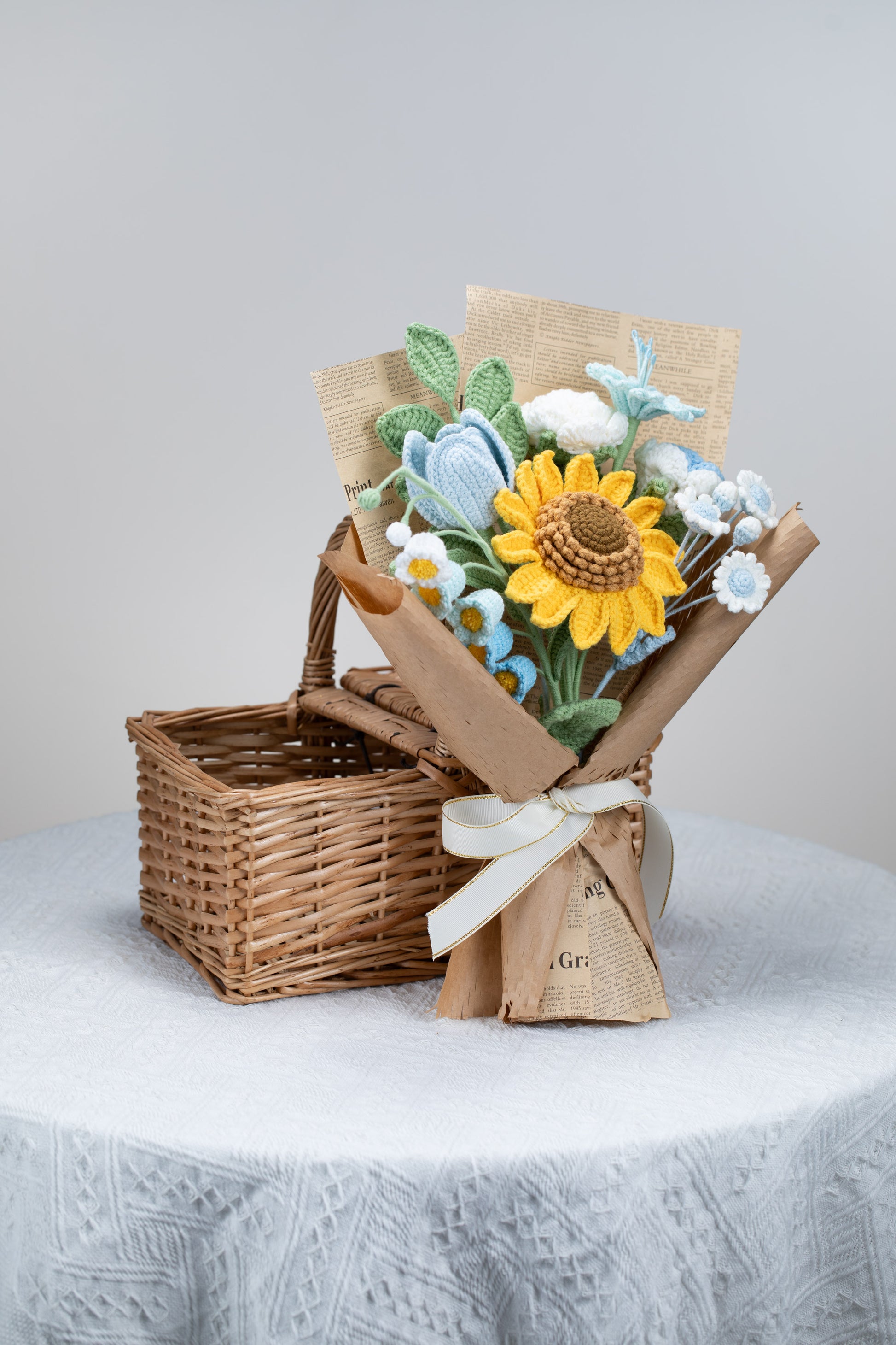 Blue Sunflower Bouquet: contains 1 Sunflower, 1 lily of the valley, 1 tulip, 2 roses, 1 cosmos, 1 daisy, 1 greenery