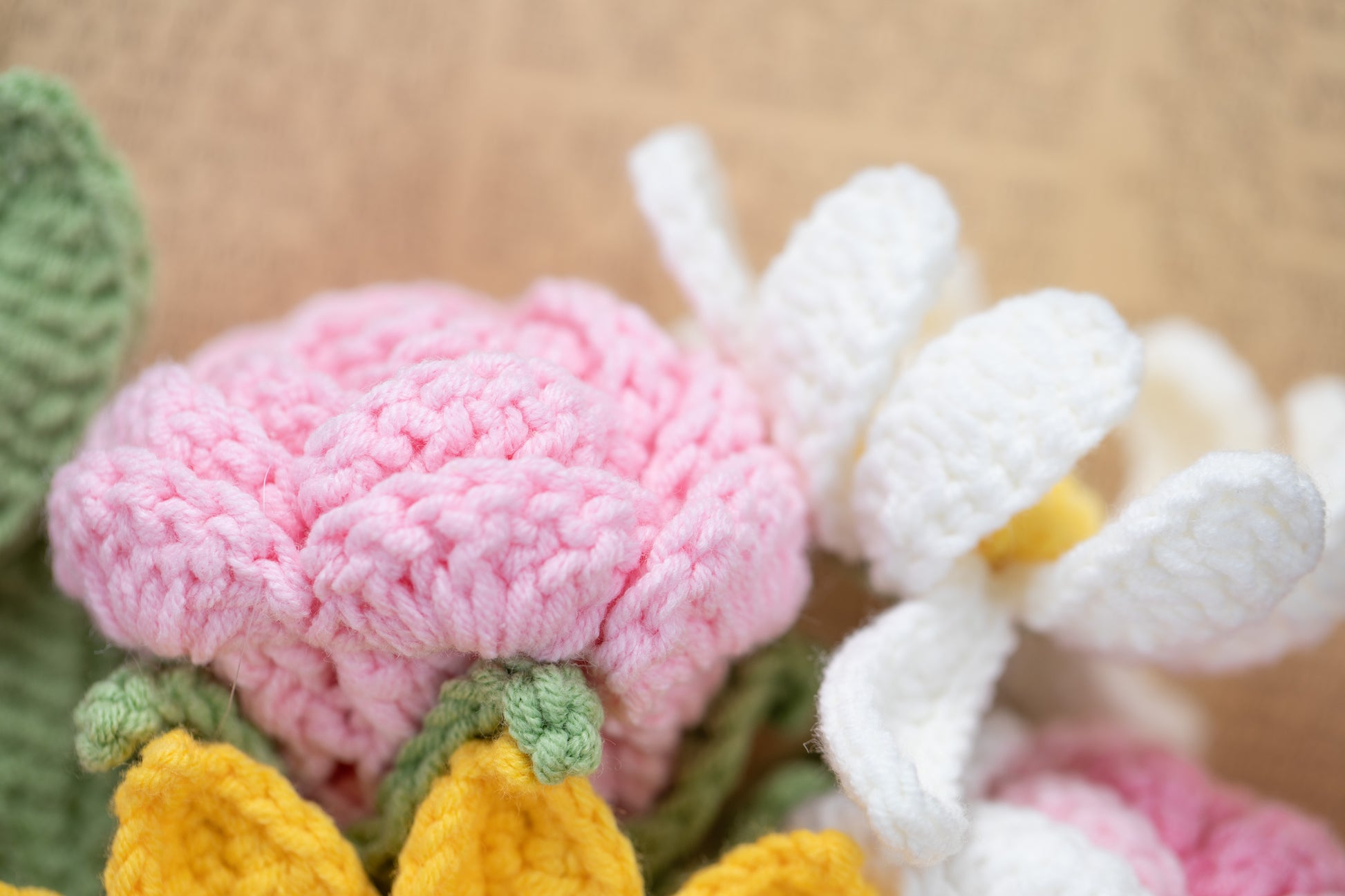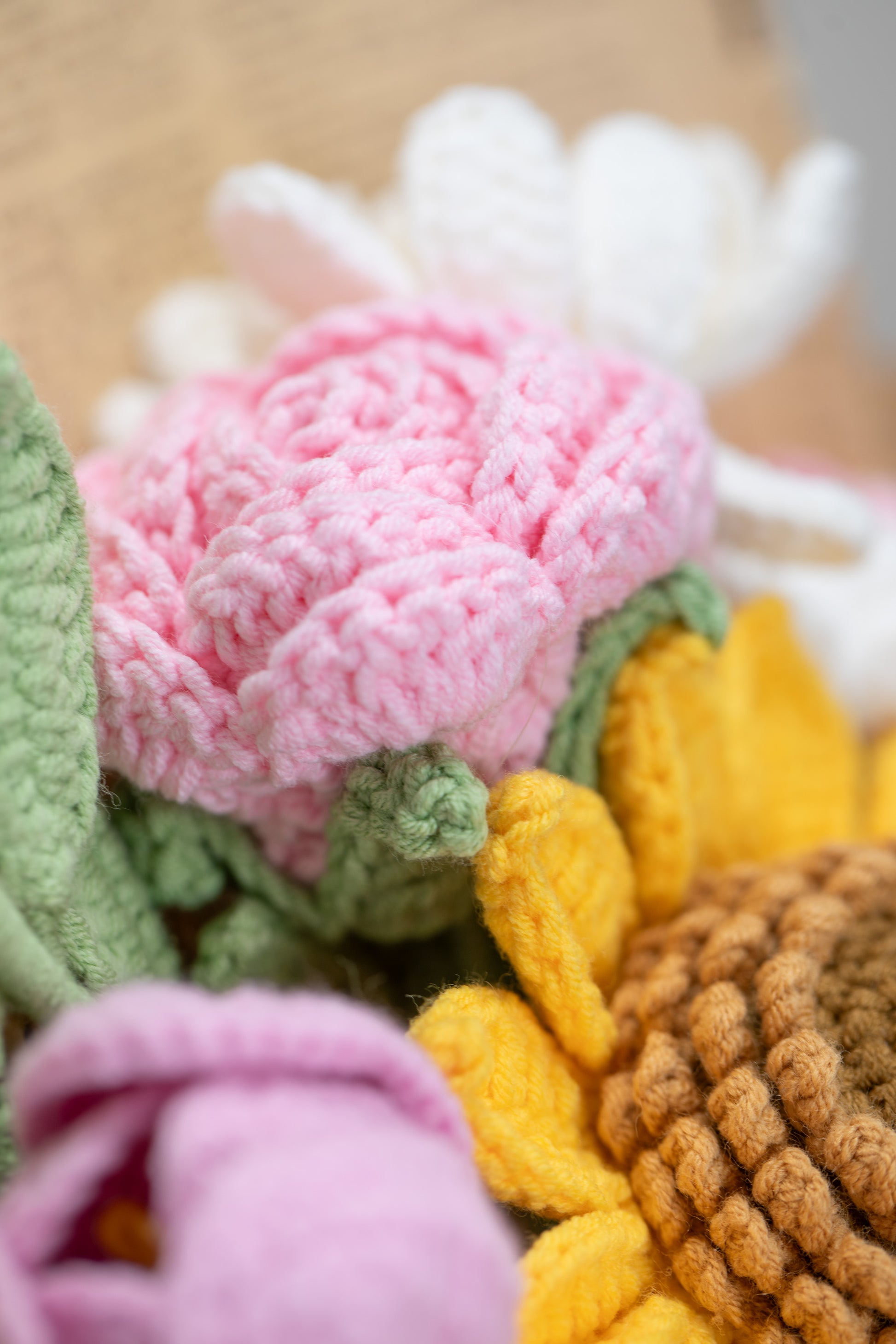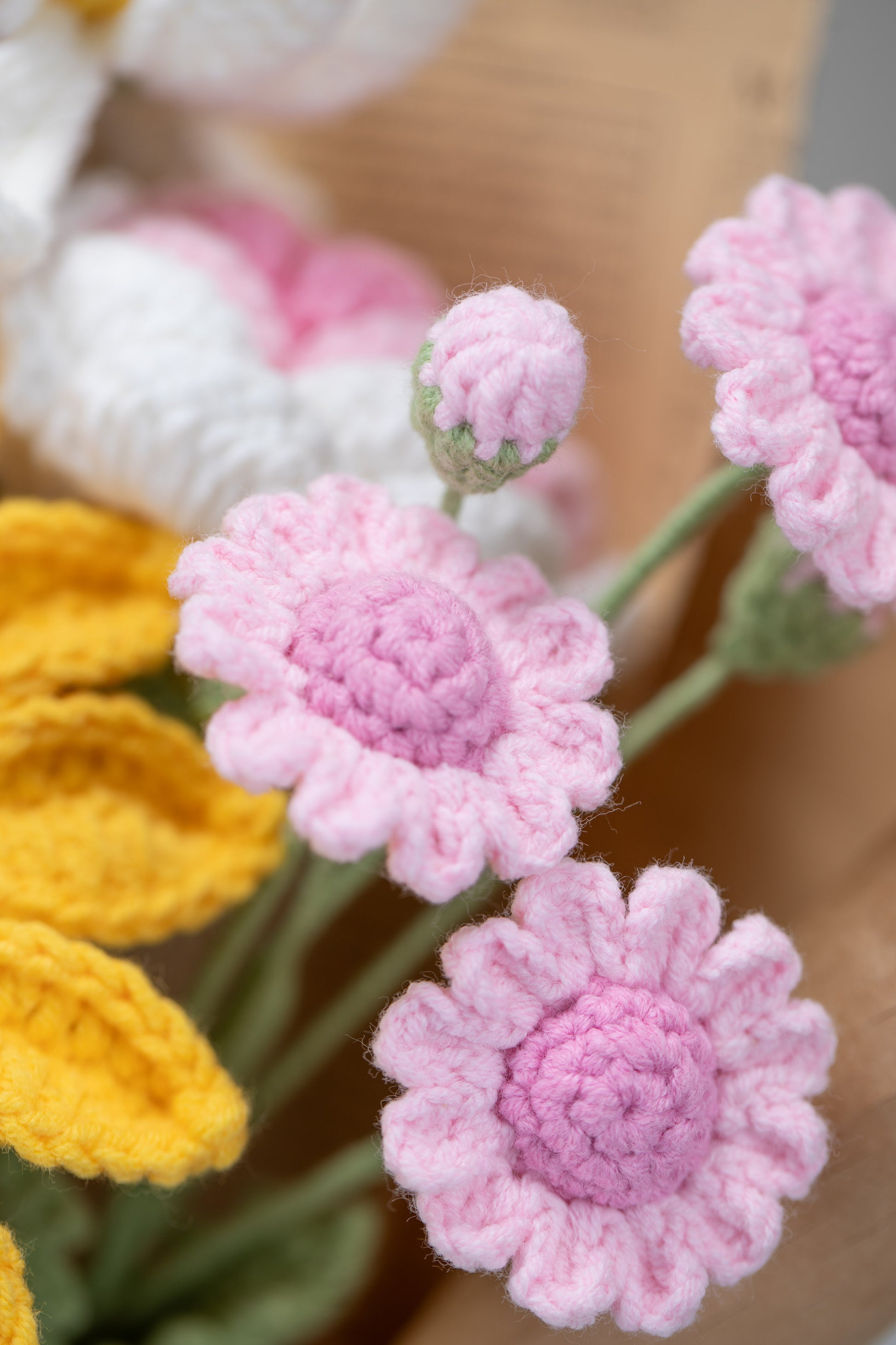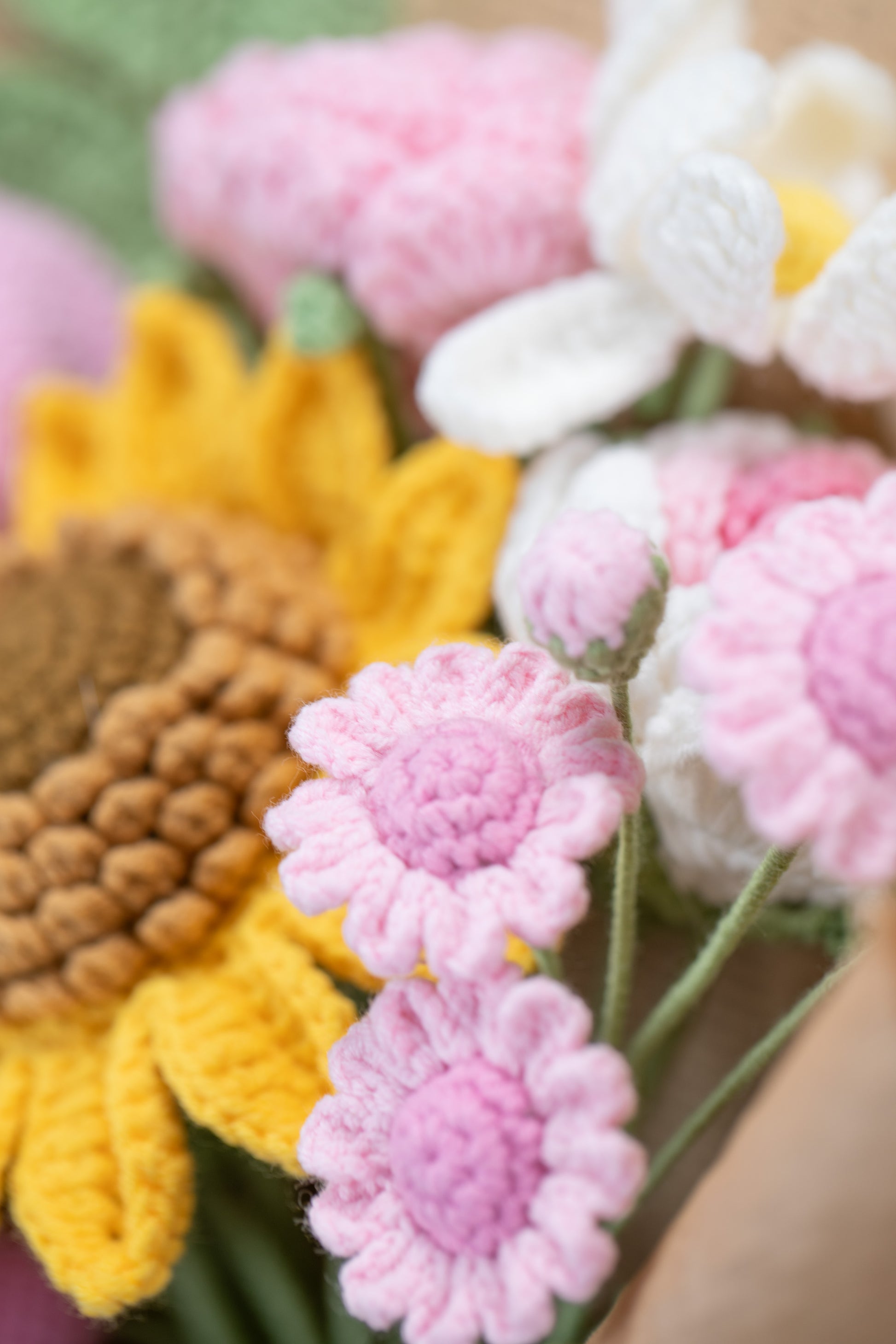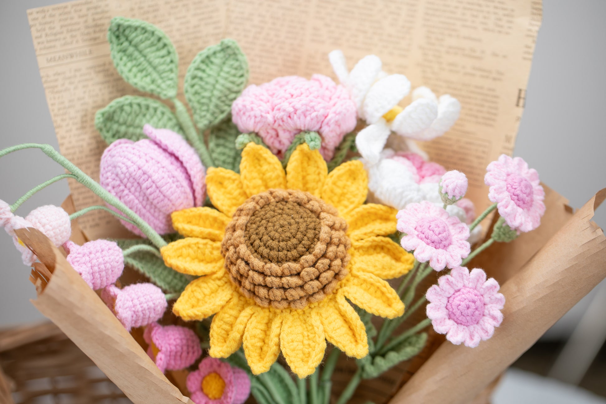 Dark Pink Sunflower Bouquet: contains 1 Sunflower, 1 lily of the valley, 1 tulip, 2 roses, 1 cosmos, 1 daisy, 1 greenery