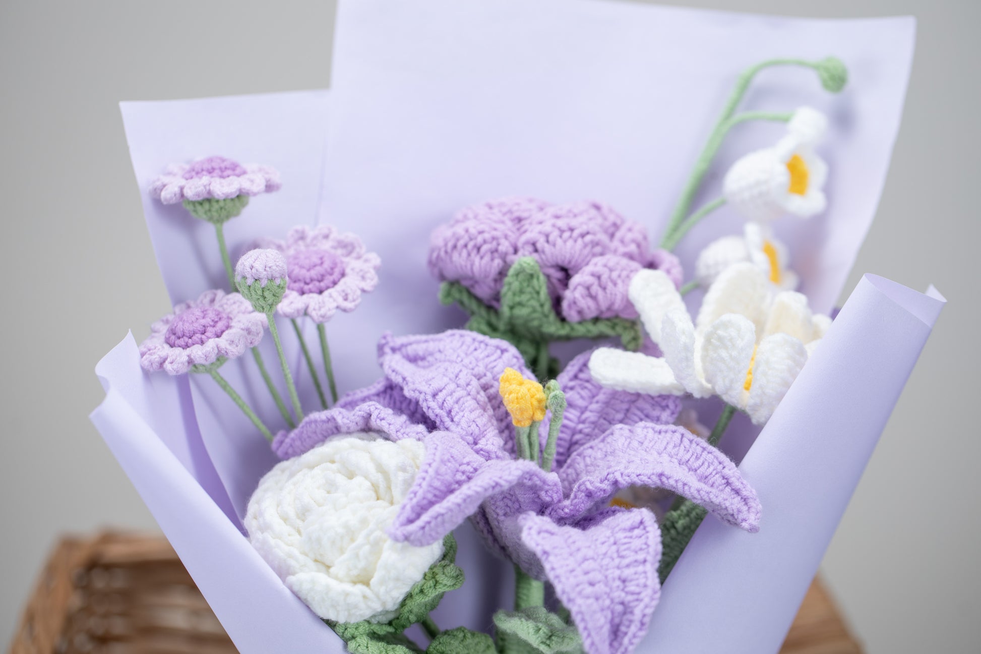 Purple Lily Bouquet: contains 1 Lily, 2 roses, 1 cosmos, 1 tulip, 1 daisy, 1 lily of the valley, 1 greenery