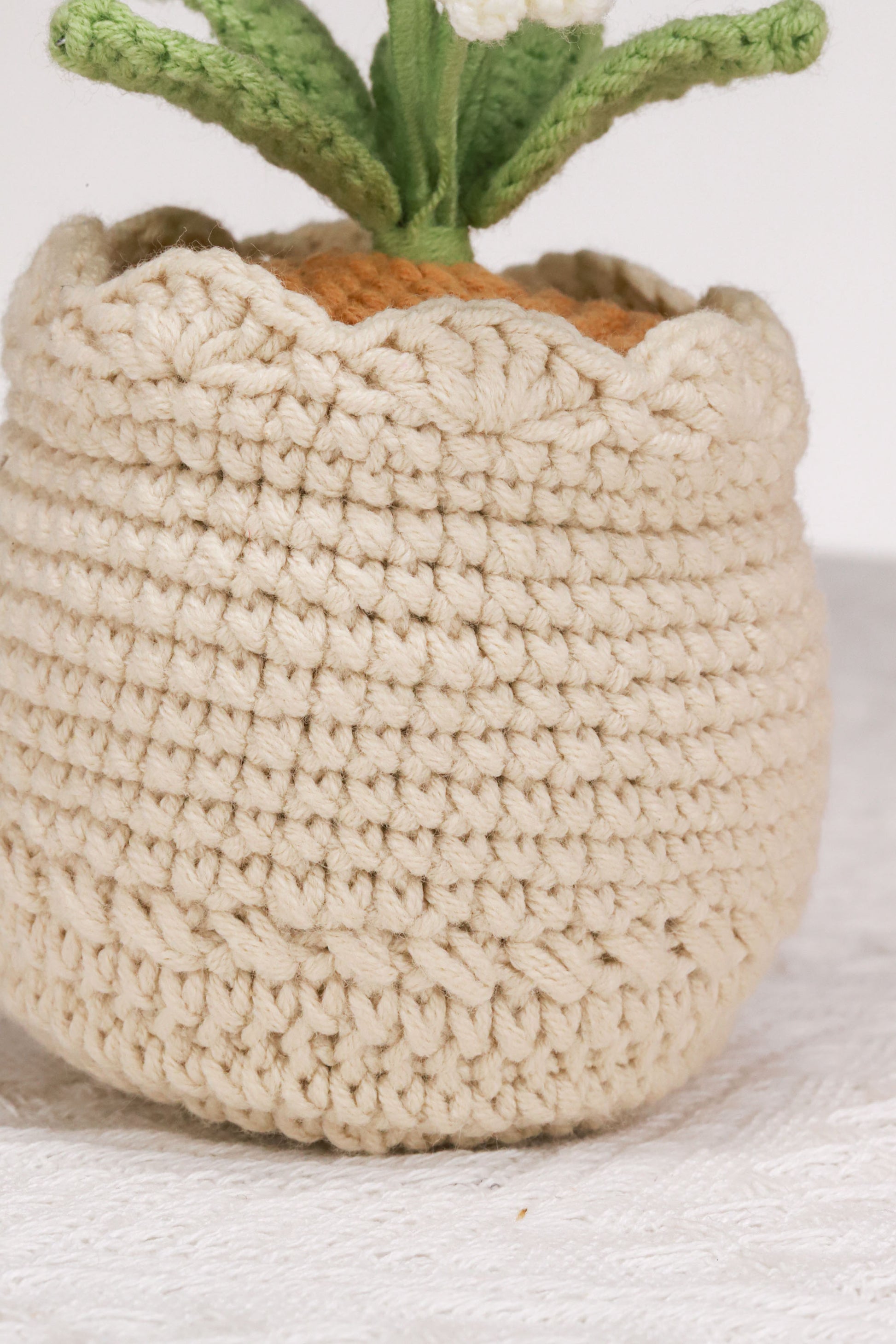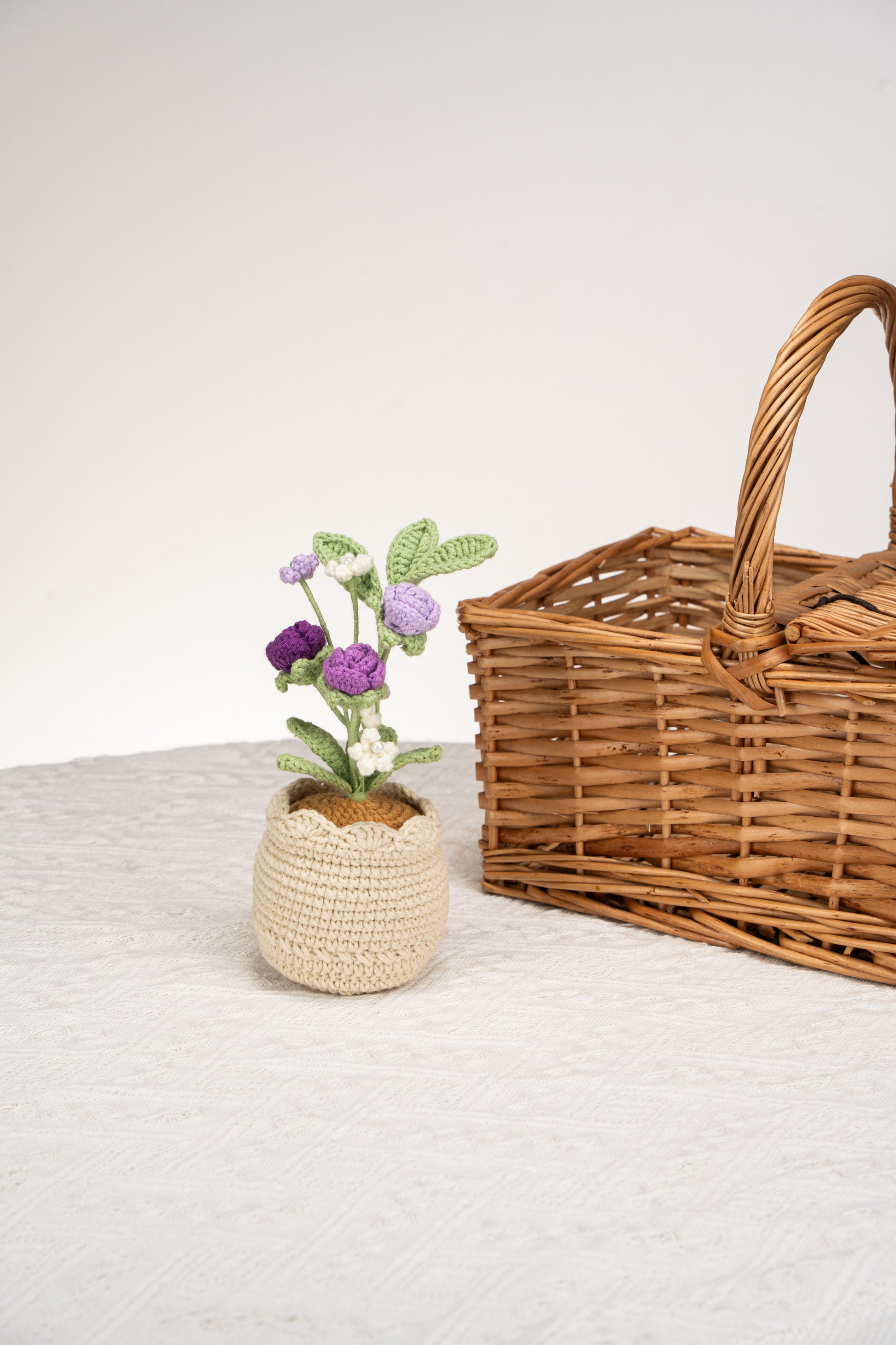 handmade crochet potted plant with purple rose and baby's breath