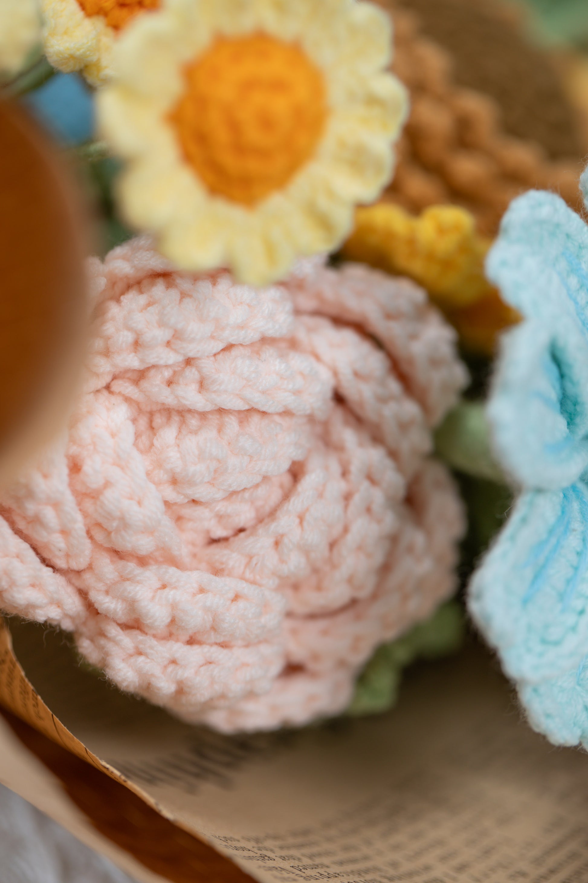 Rainbow color Sunflower Bouquet: contains 1 Sunflower, 1 lily of the valley, 1 tulip, 2 roses, 1 cosmos, 1 daisy, 1 greenery