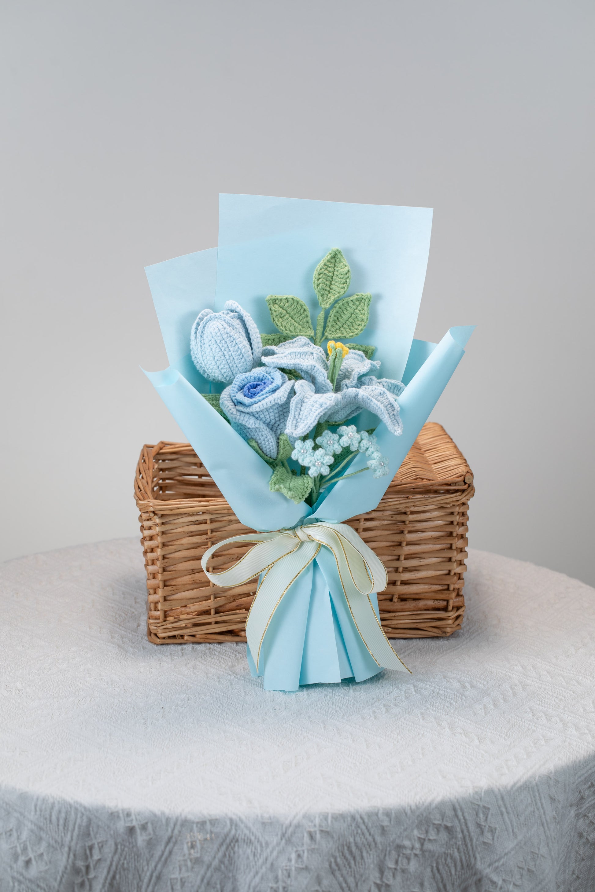 Small Blue Lily with Tulip Bouquet: contains 1 Lily, 1 tulip, 1 rose, 1 baby's breath, 1 greenery