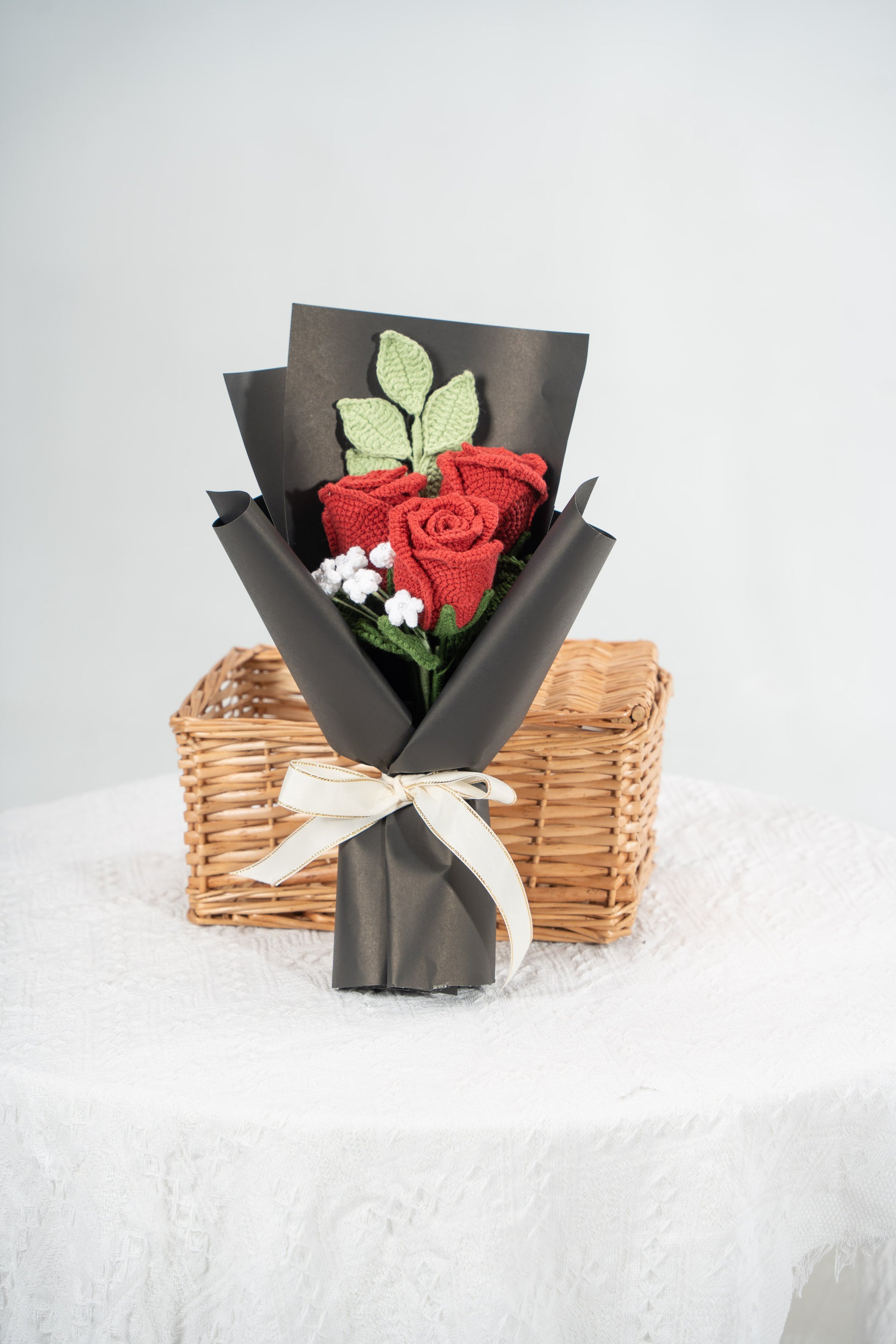 Small Burgundy Rose Bouquet: contains 3 roses, 1 baby's breath, 1 greenery