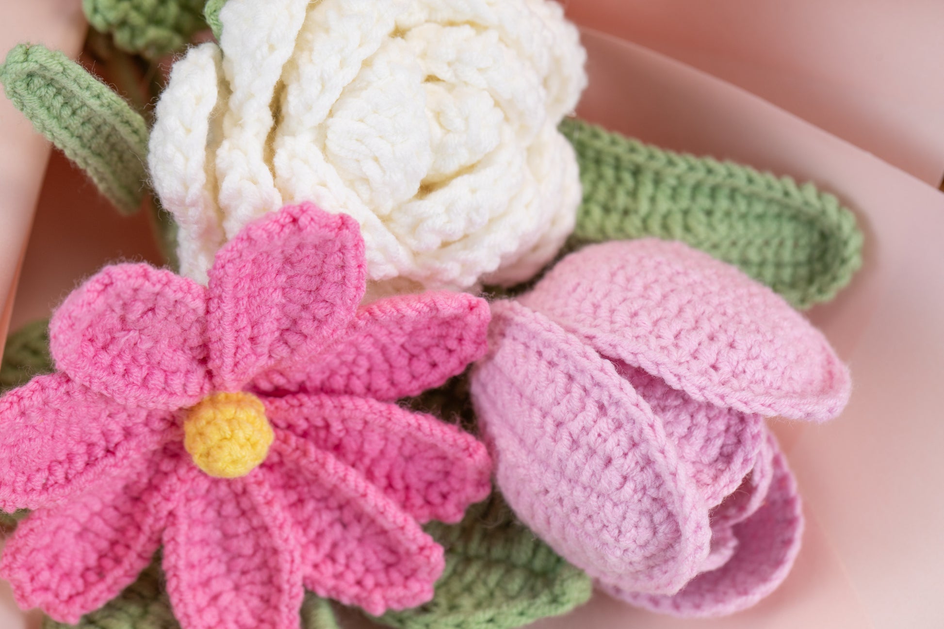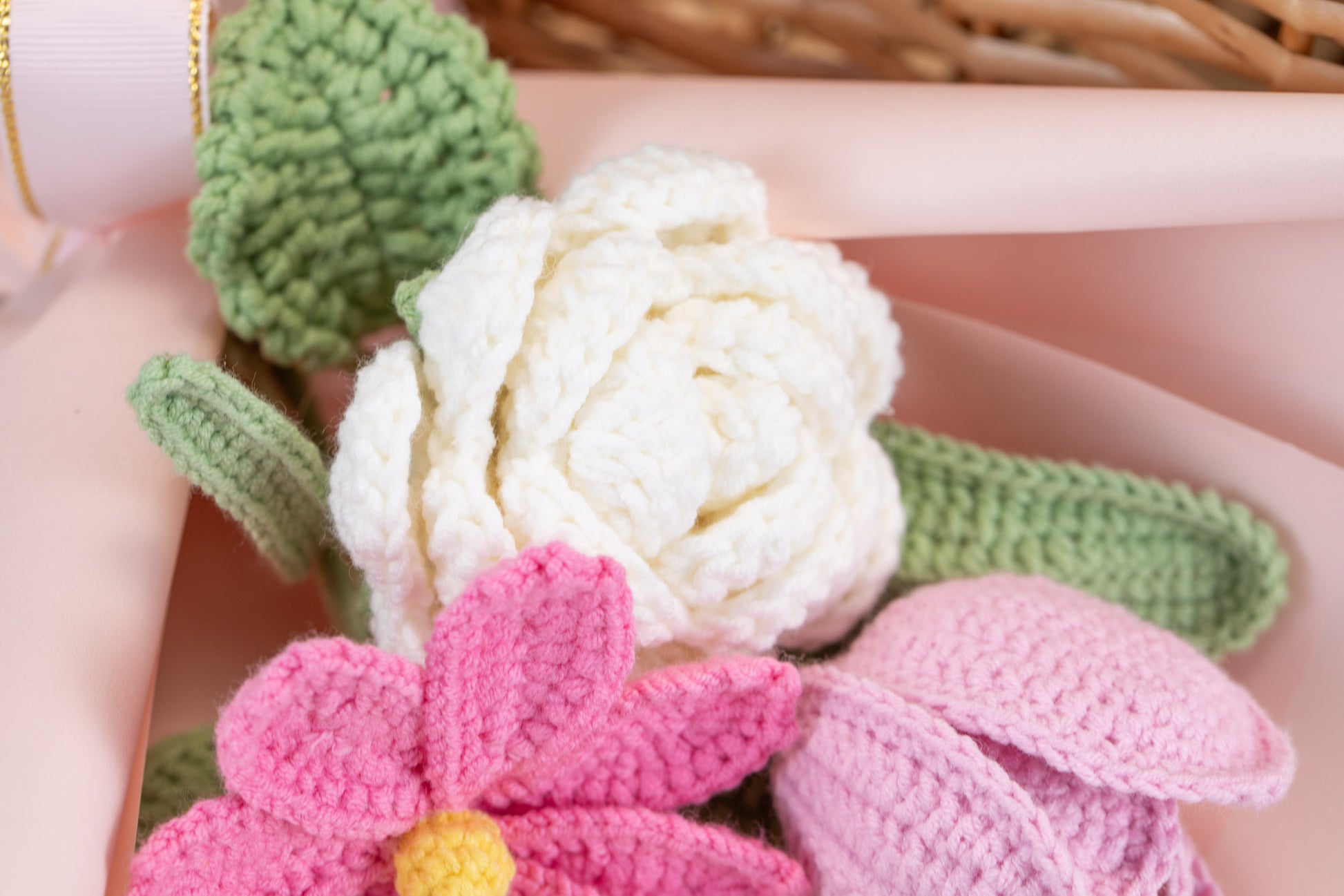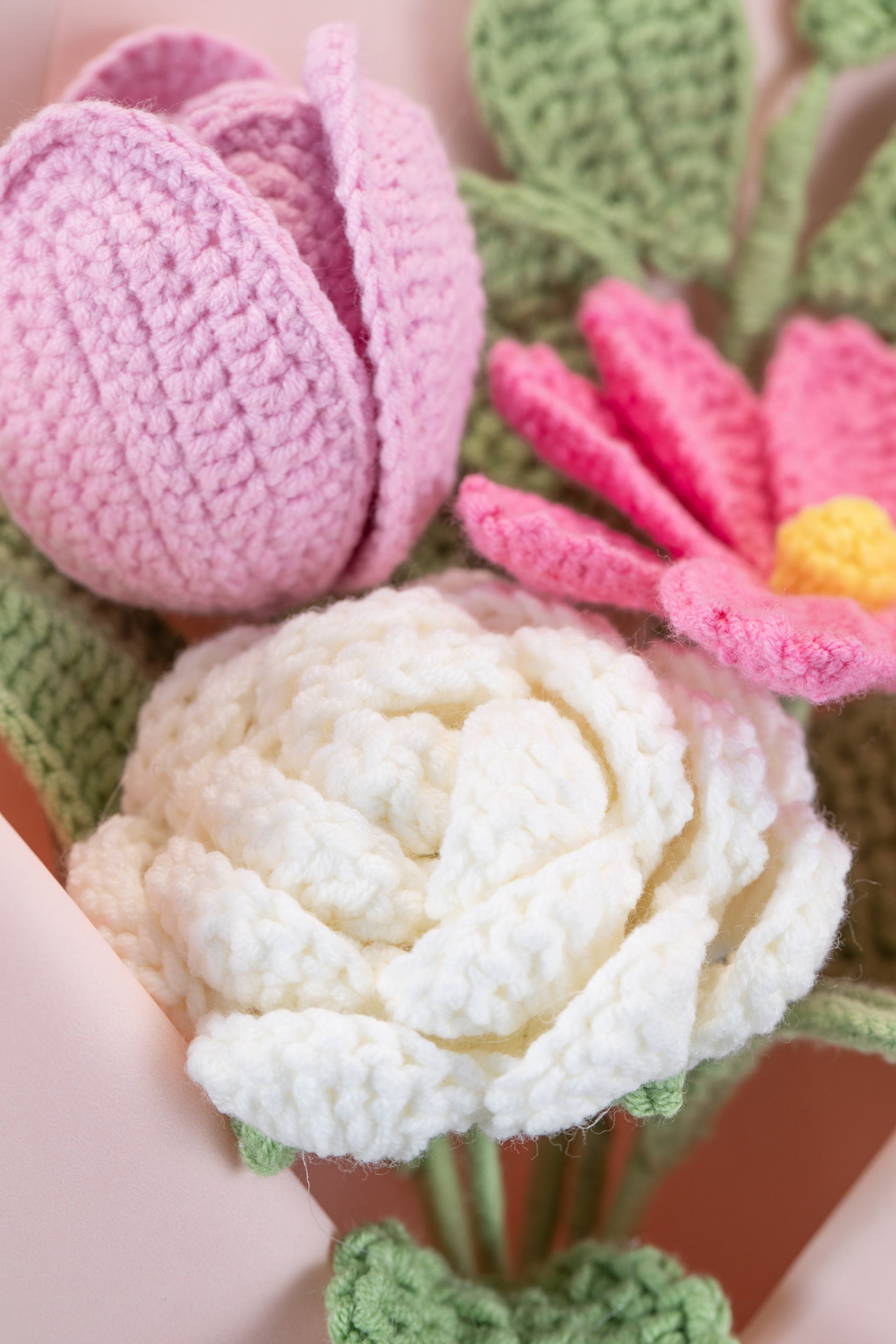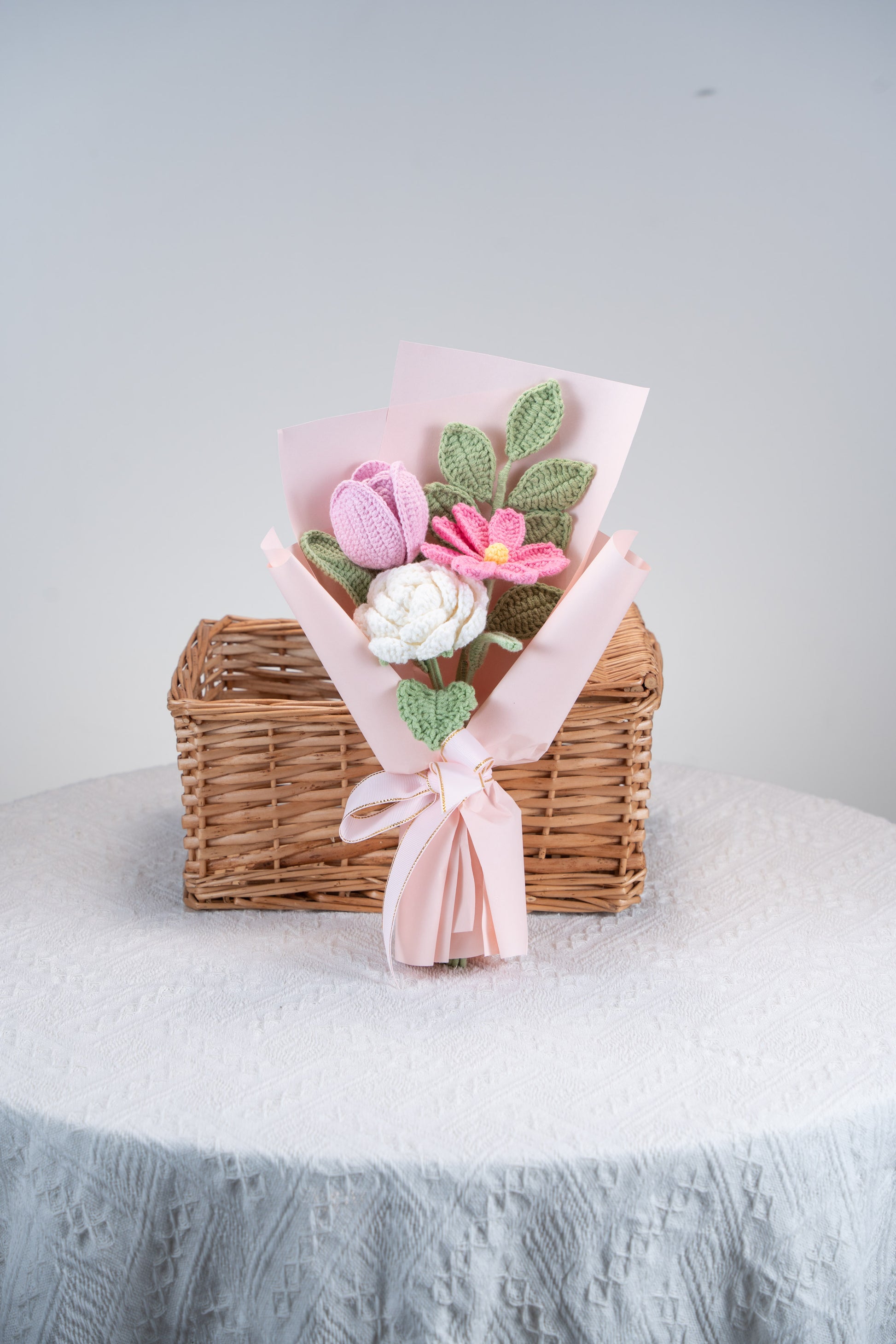 Small Hot Pink Rose with Cosmos Bouquet: contains 1 Cosmos, 1 tulip, 1 rose, 1 greenery