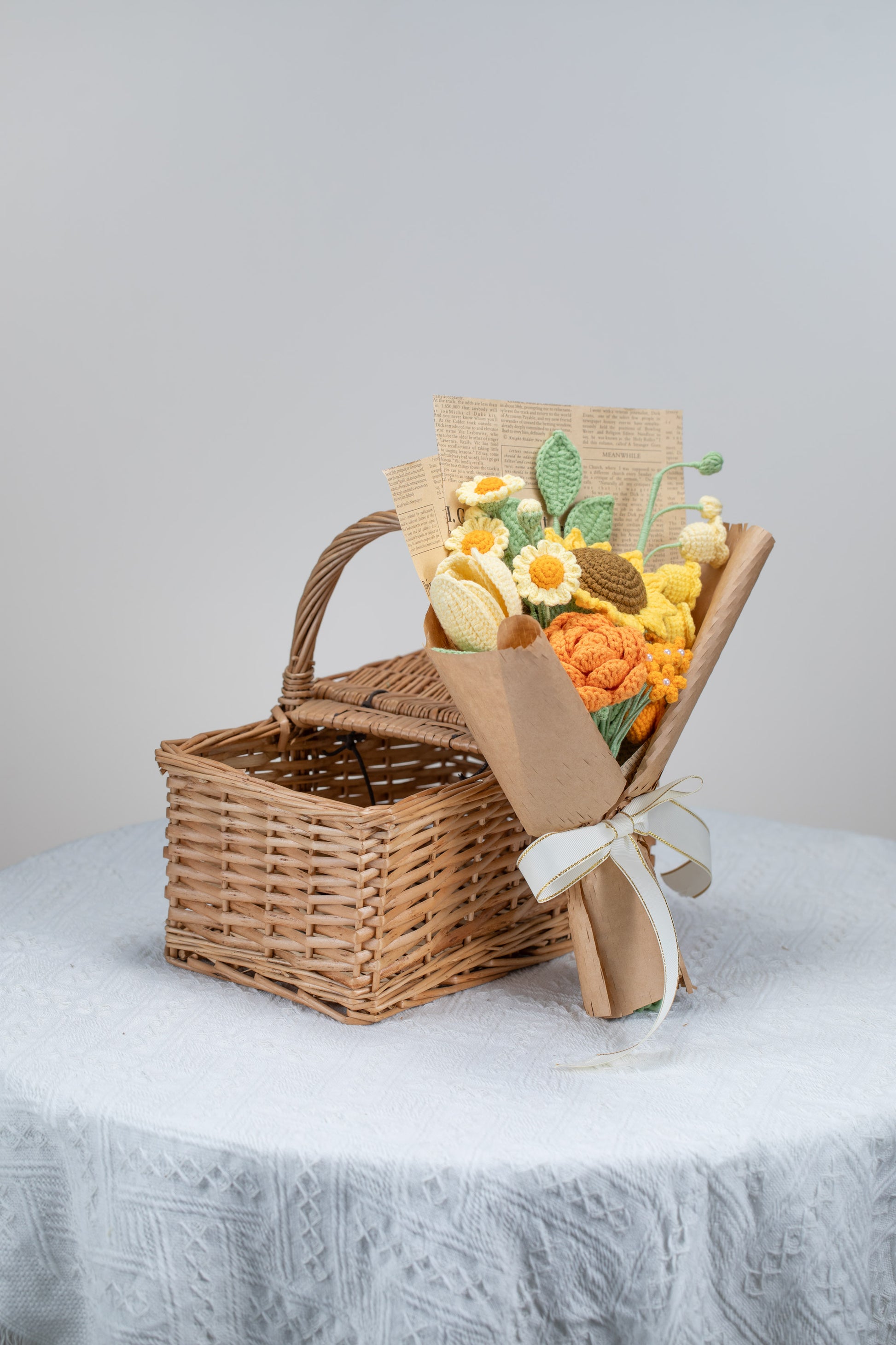 Small Orange Sunflower Bouquet: contains 1 Sunflower, 1 rose, 1 lily of the valley, 1 daisy, 1 tulip, 1 baby's breath, 1 greenery