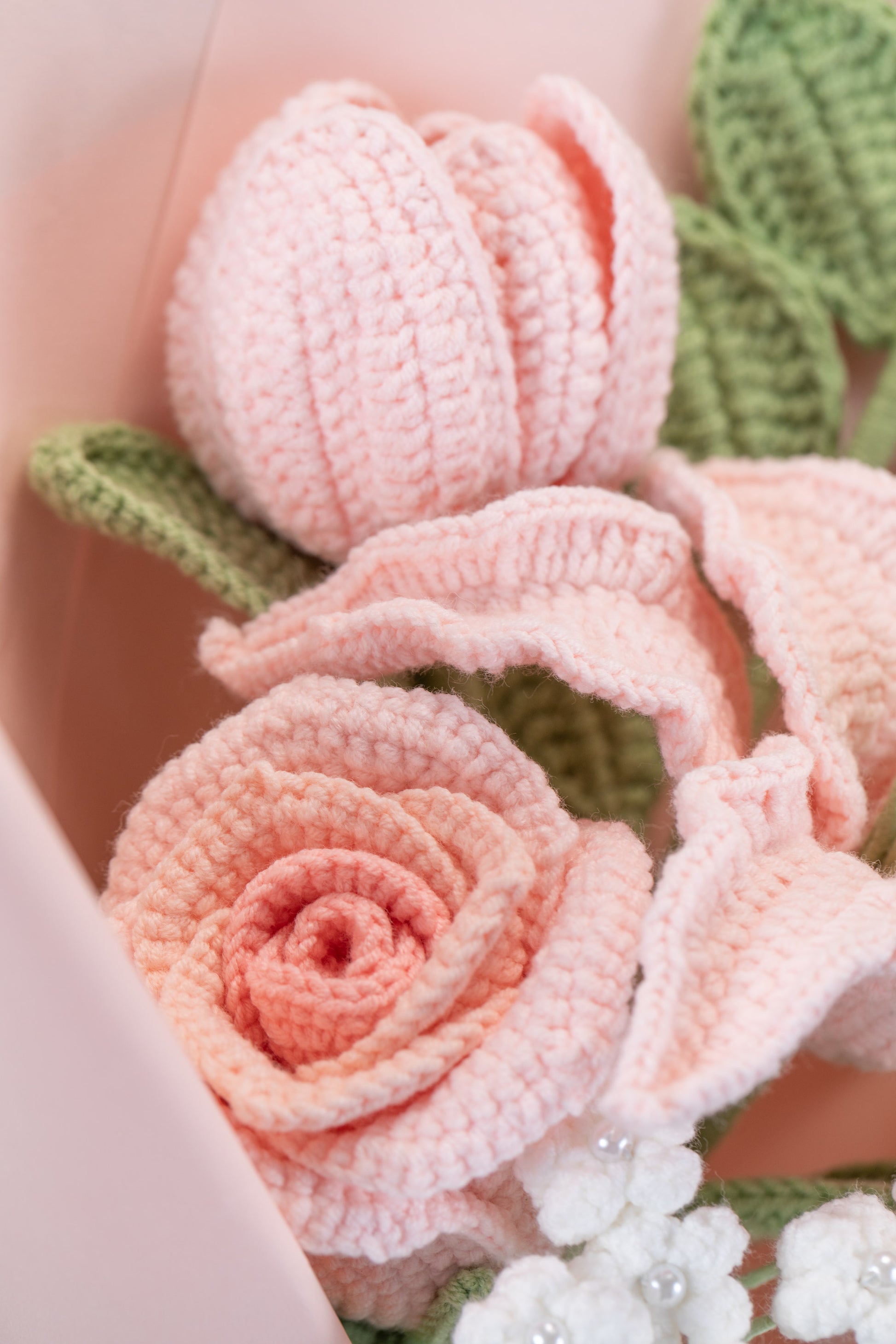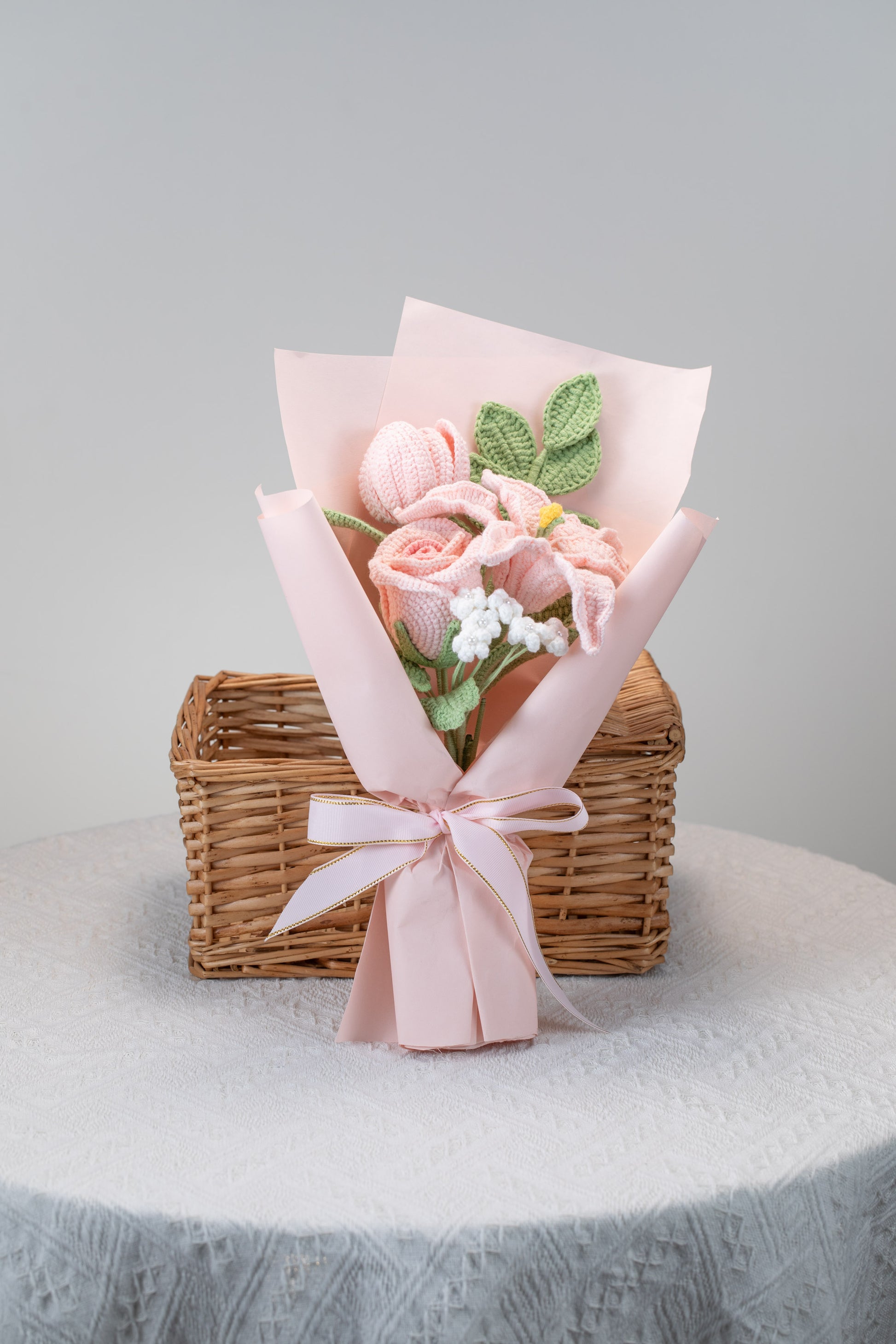 Small Pink Lily with Tulip Bouquet: contains 1 Lily, 1 tulip, 1 rose, 1 baby's breath, 1 greenery