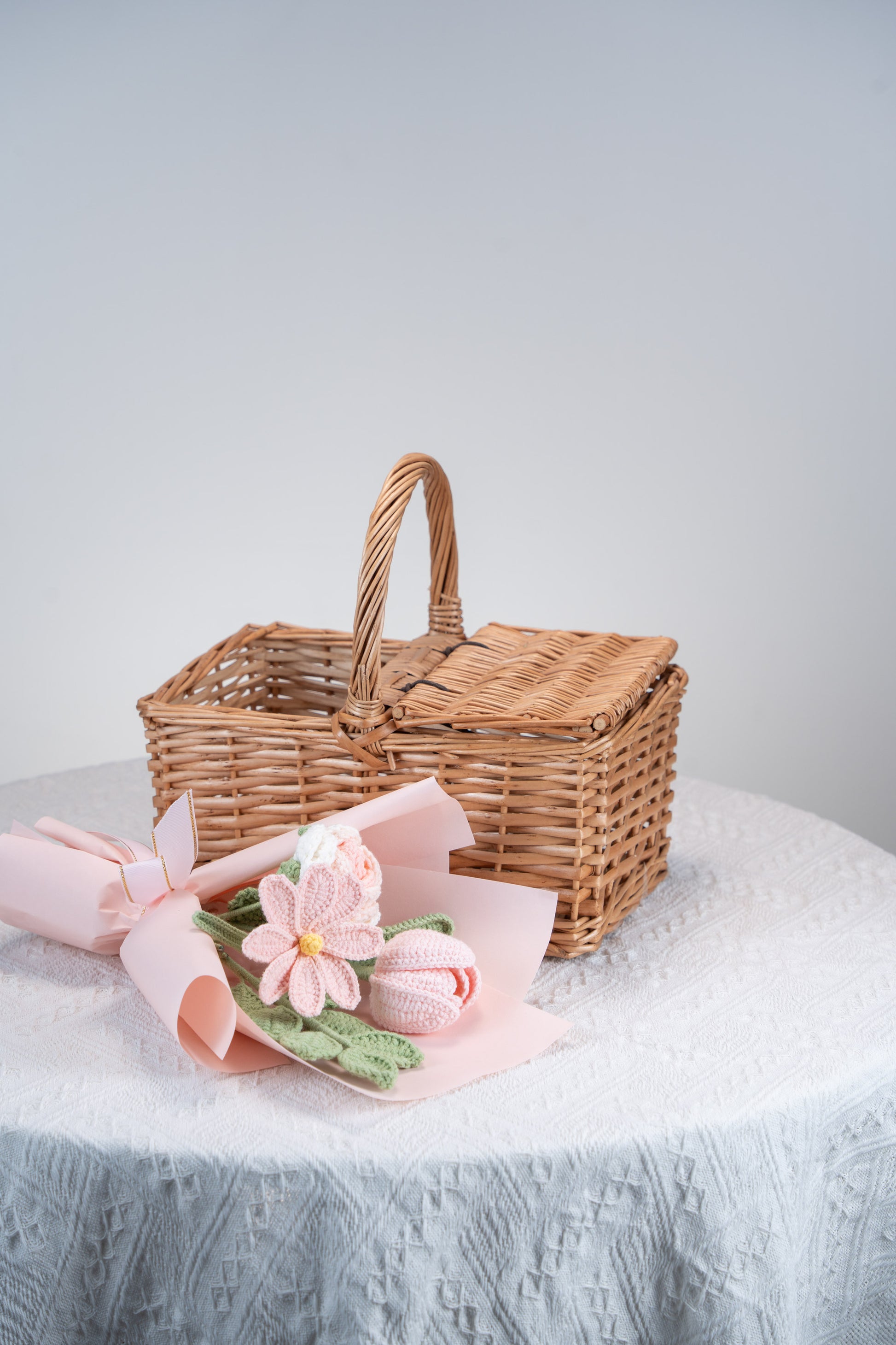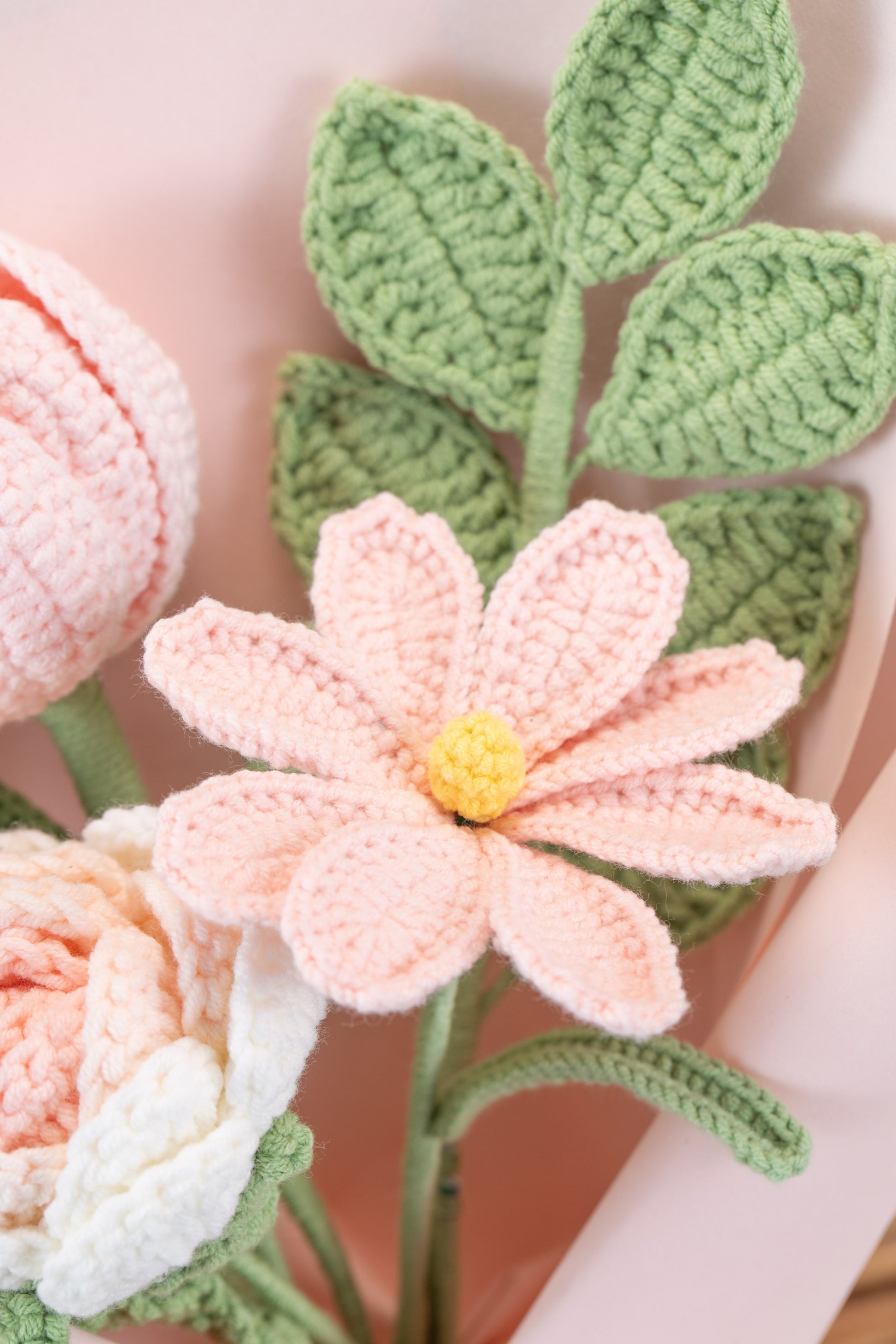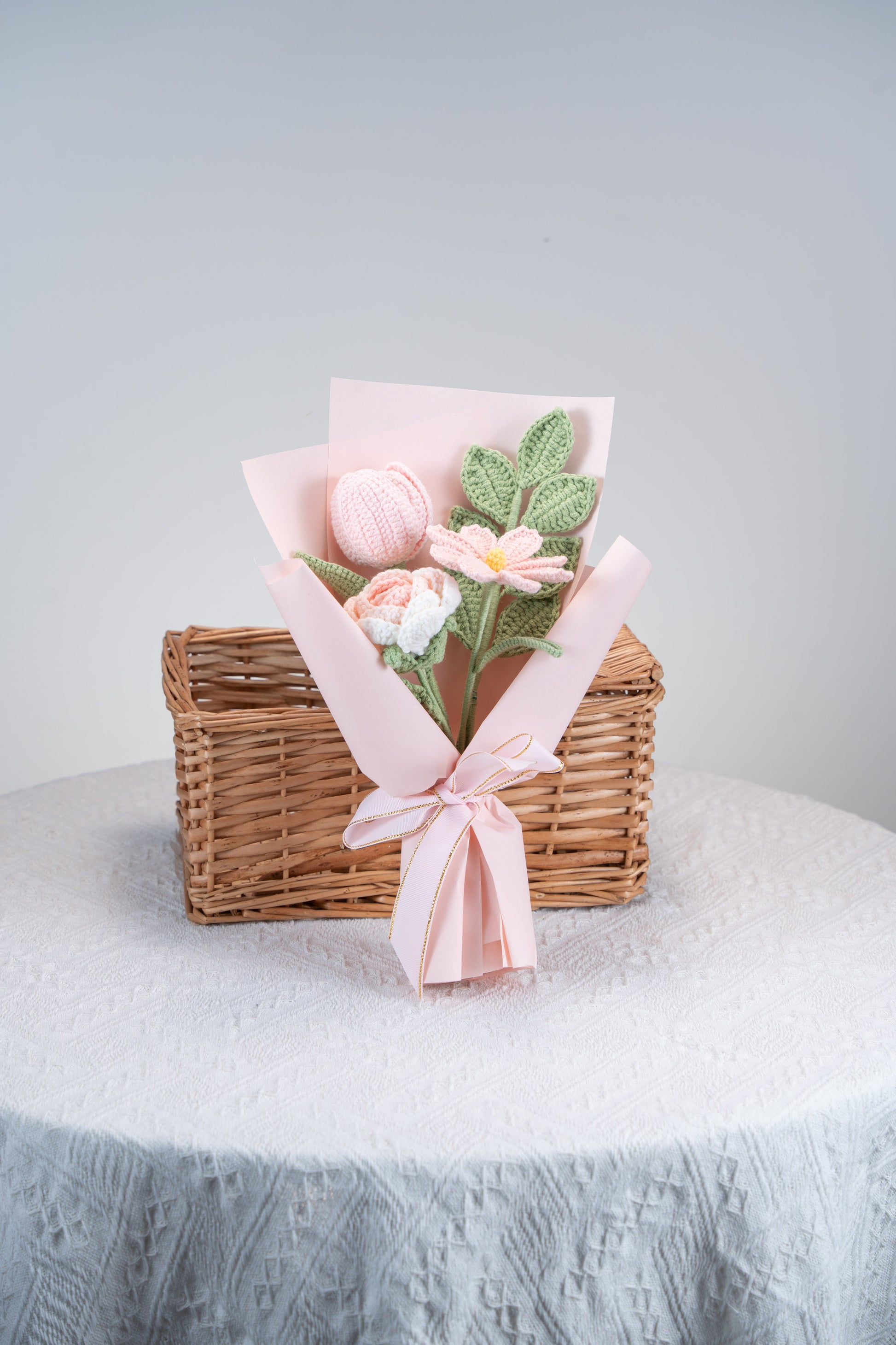 Small Pink Rose with Cosmos Bouquet: contains 1 Cosmos, 1 tulip, 1 rose, 1 greenery