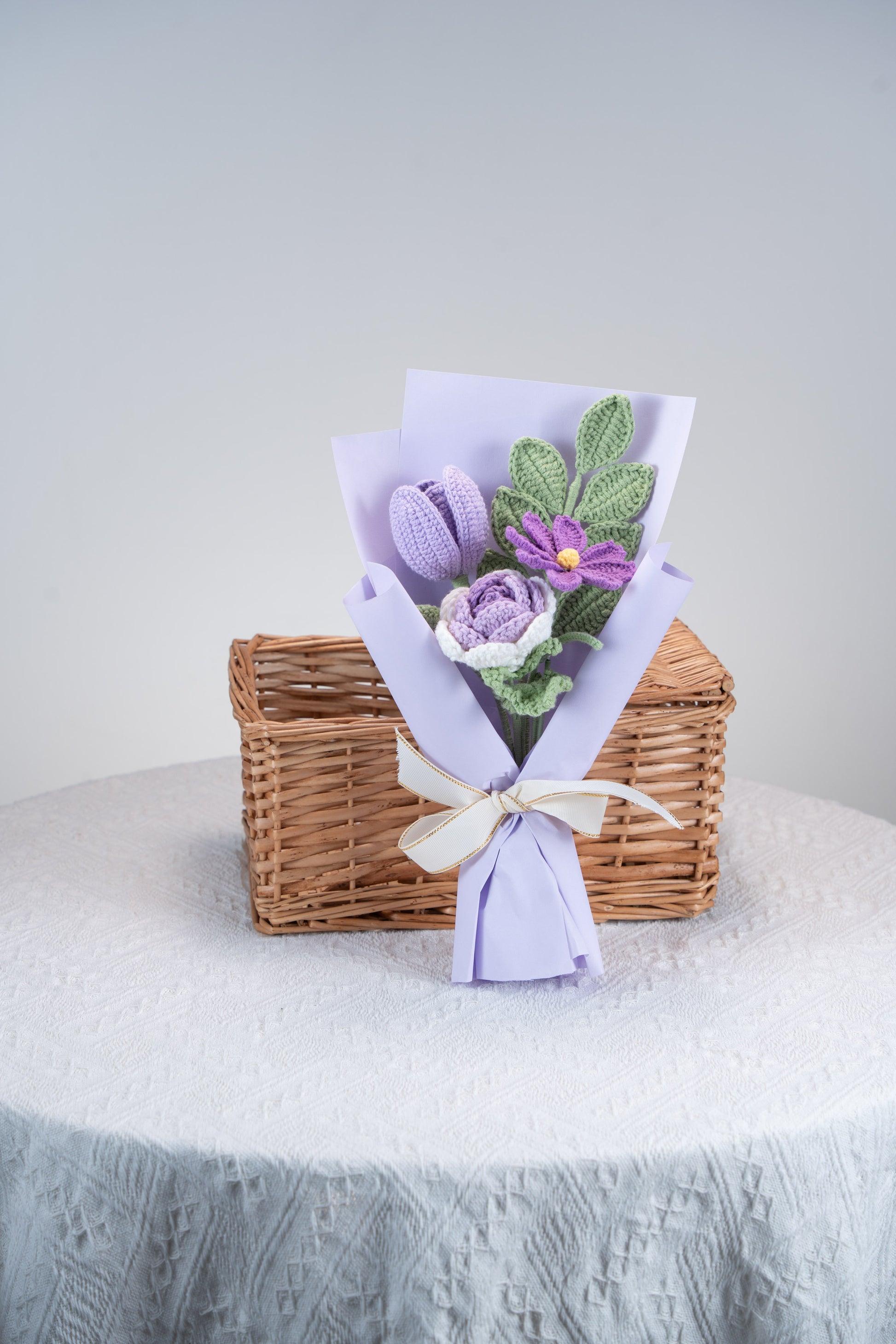 Small Purple Rose with Cosmos Bouquet: contains 1 Cosmos, 1 tulip, 1 rose, 1 greenery
