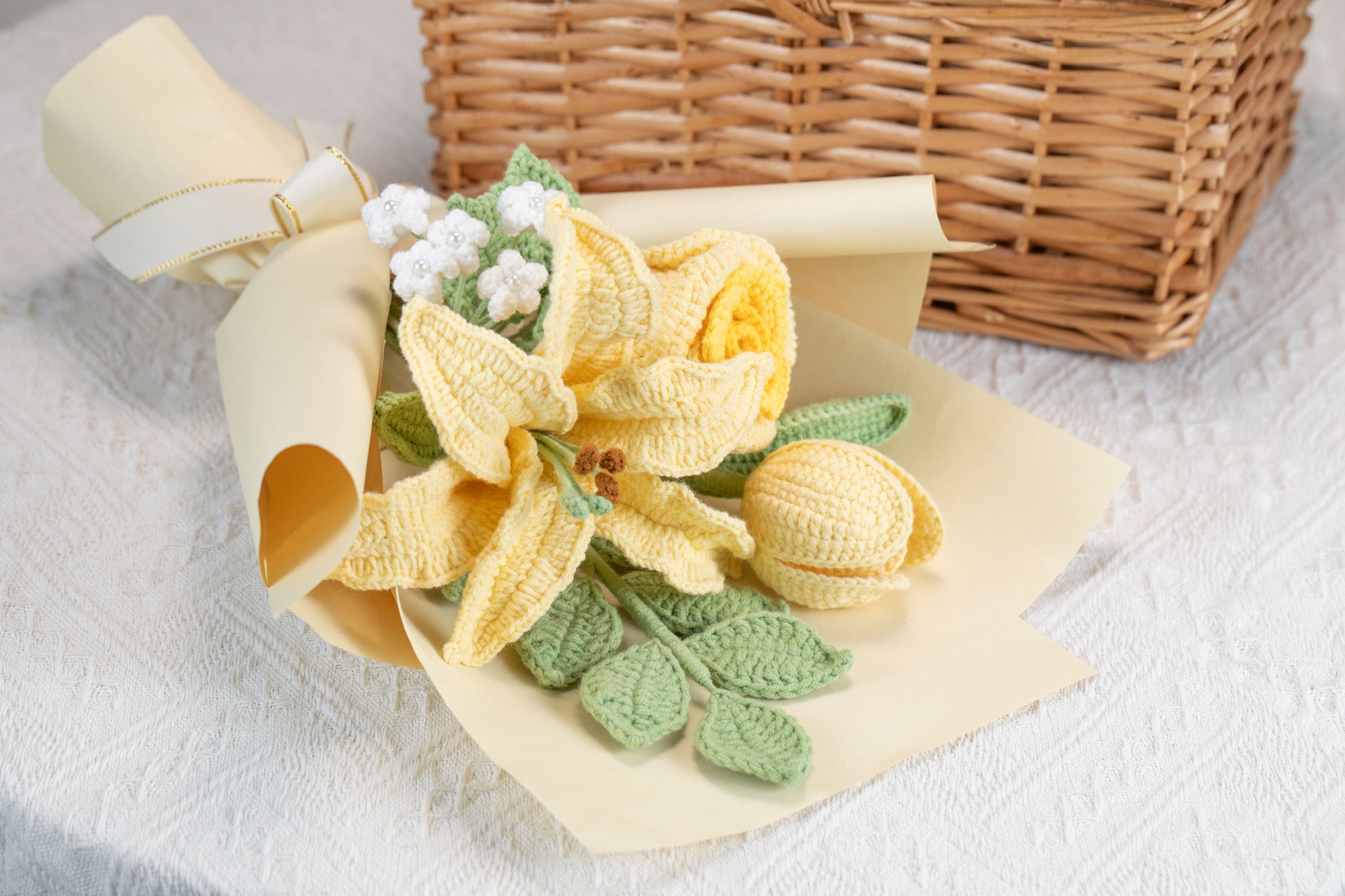 Small Yellow Lily with Tulip Bouquet: contains 1 Lily, 1 tulip, 1 rose, 1 baby's breath, 1 greenery
