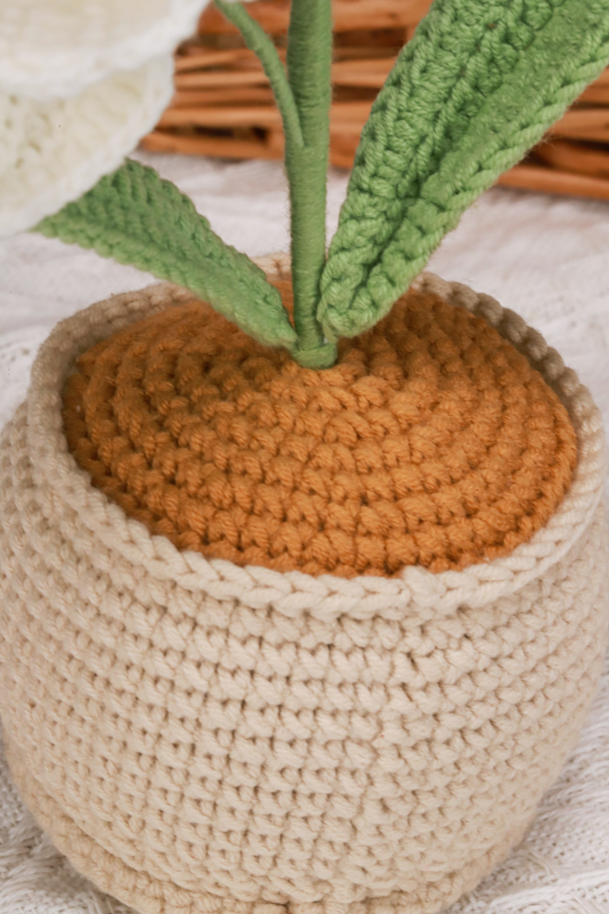 handmade crochet potted plant with white moth orchid