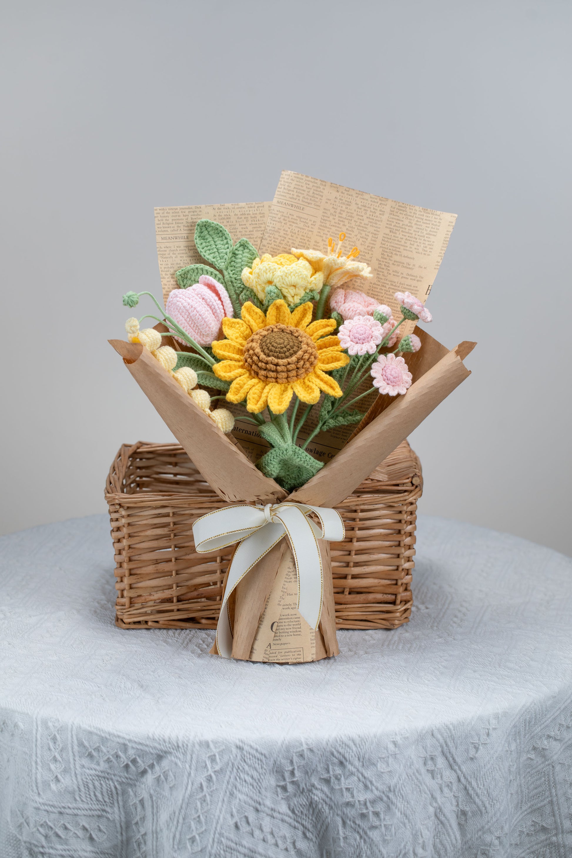 Yellow/Pink Sunflower Bouquet: contains 1 Sunflower, 1 lily of the valley, 1 tulip, 2 roses, 1 cosmos, 1 daisy, 1 greenery