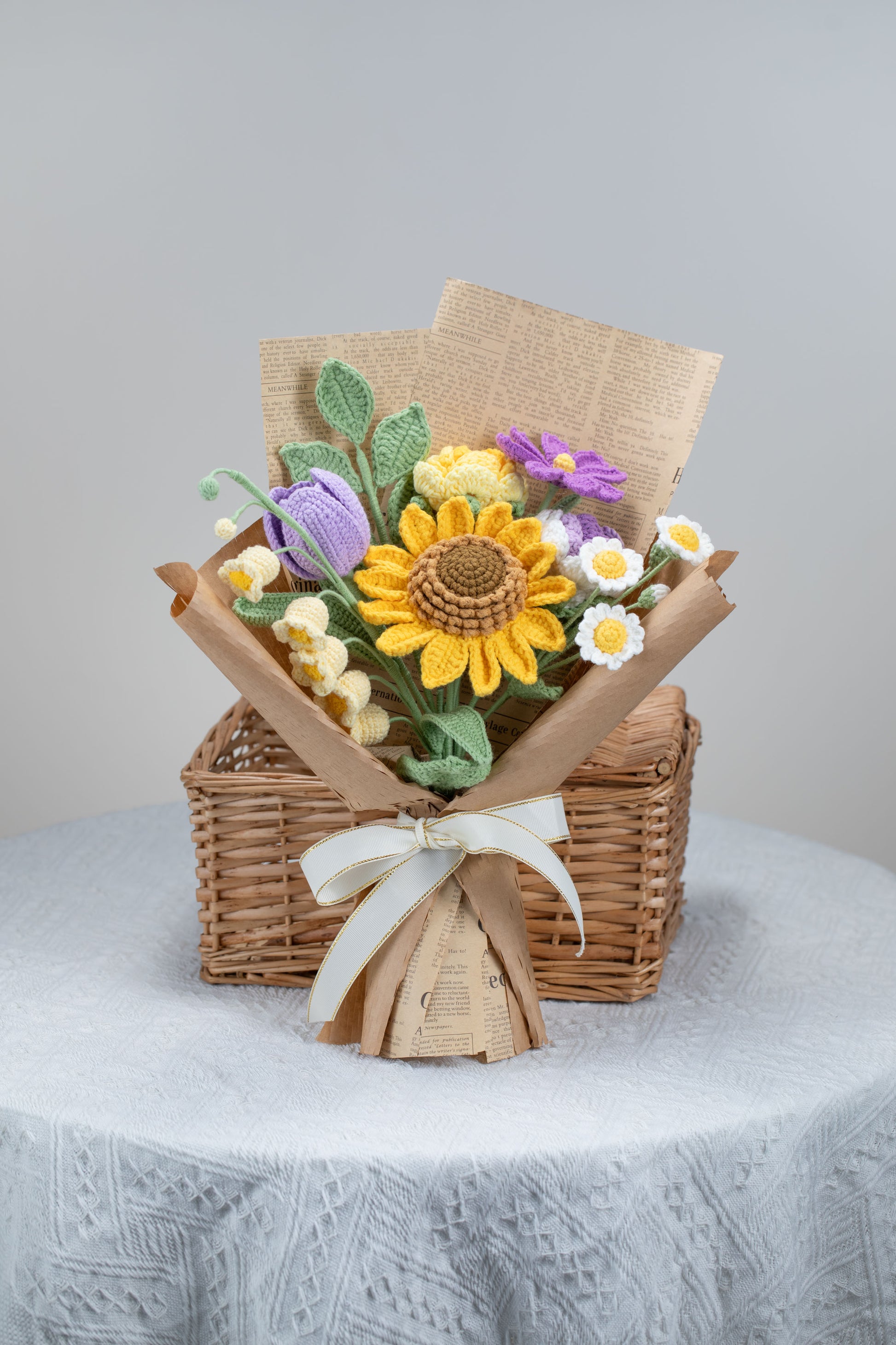 Yellow/Purple Sunflower Bouquet: contains 1 Sunflower, 1 lily of the valley, 1 tulip, 2 roses, 1 cosmos, 1 daisy, 1 greenery