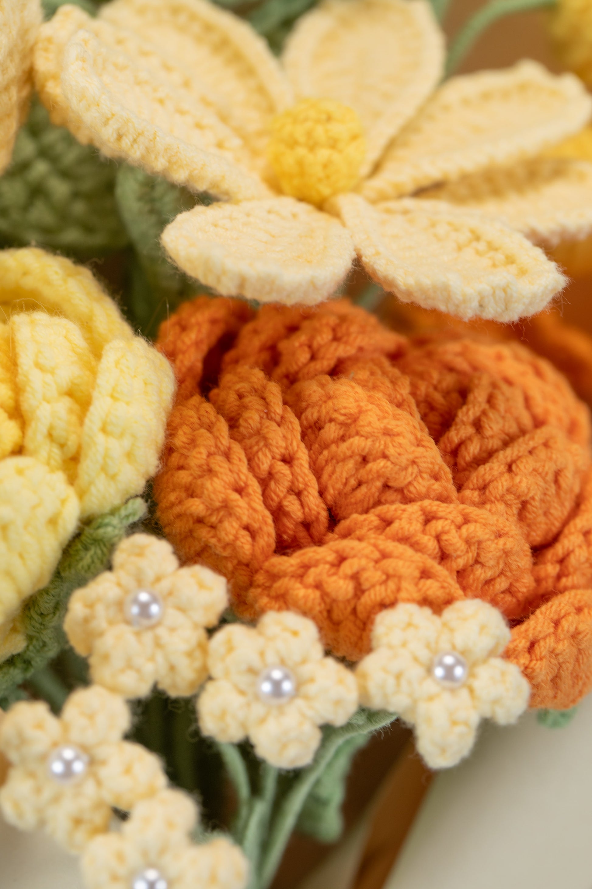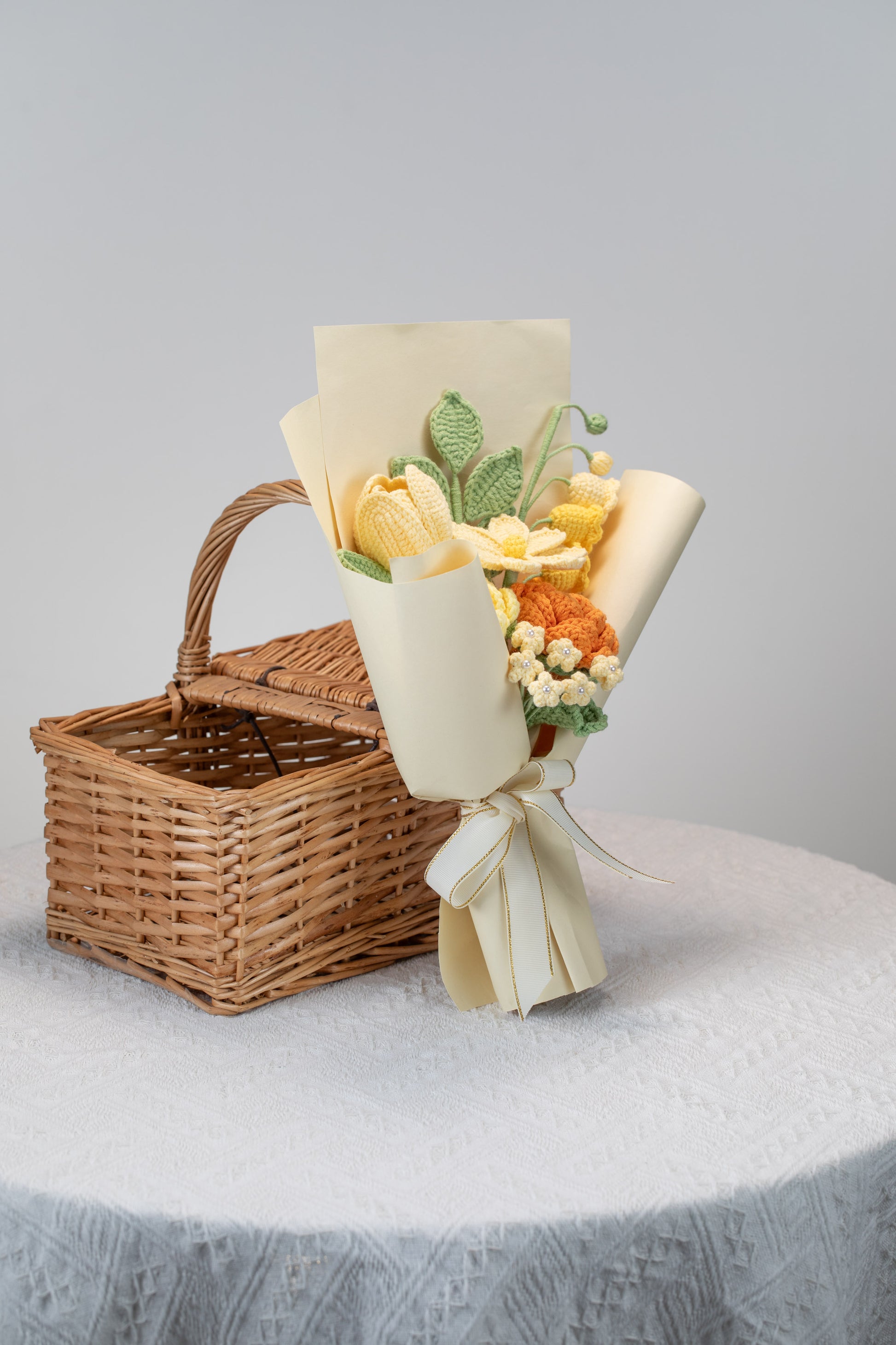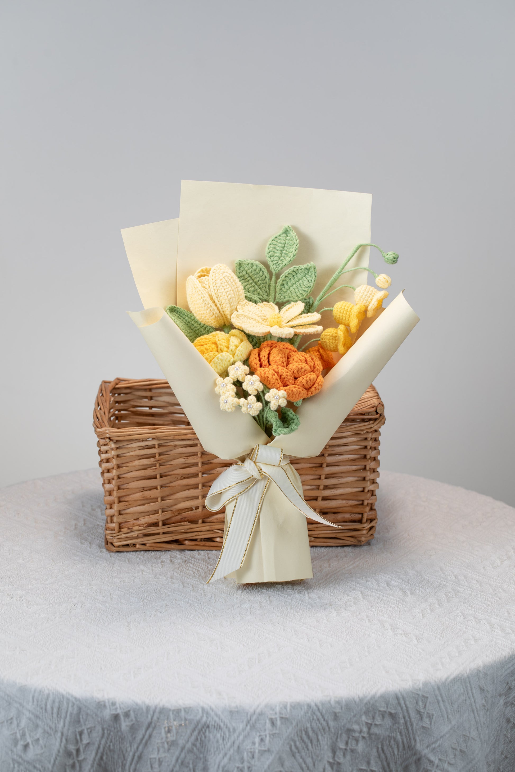 Yellow Rose with Cosmos Bouquet: contains: 1 Cosmos, 1 tulip, 2 roses, 1 lily of the valley, 1 baby's breath, 1 greenery