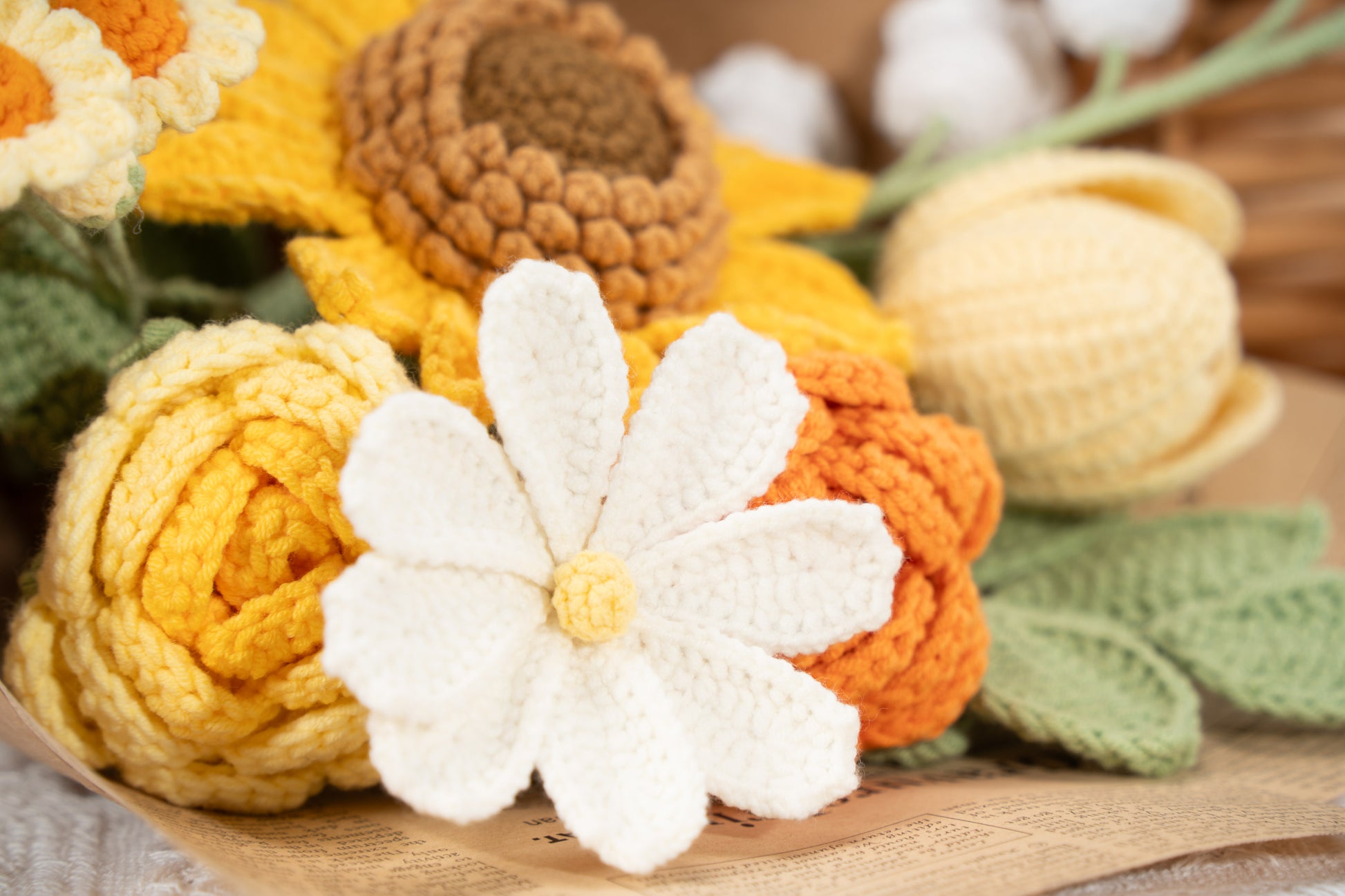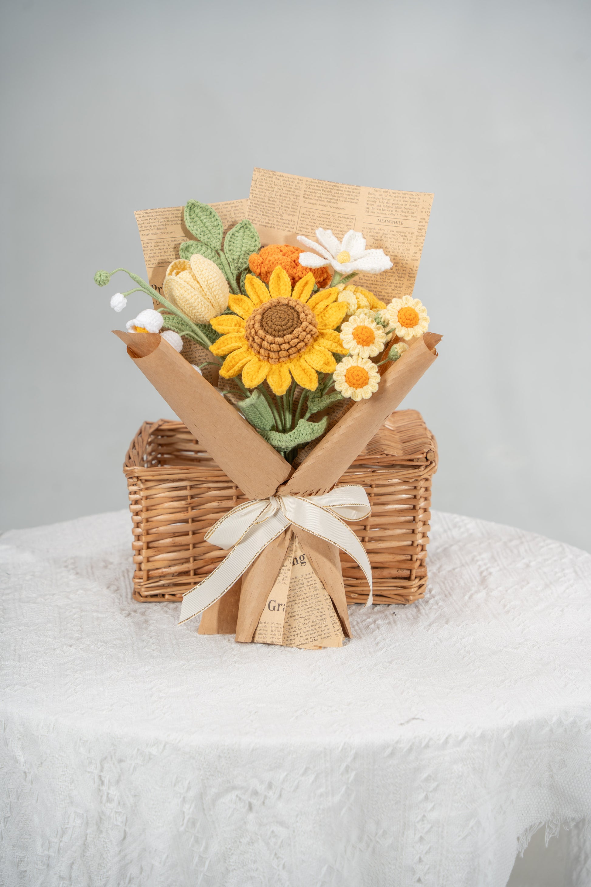 Yellow Sunflower Bouquet: contains 1 Sunflower, 1 lily of the valley, 1 tulip, 2 roses, 1 cosmos, 1 daisy, 1 greenery