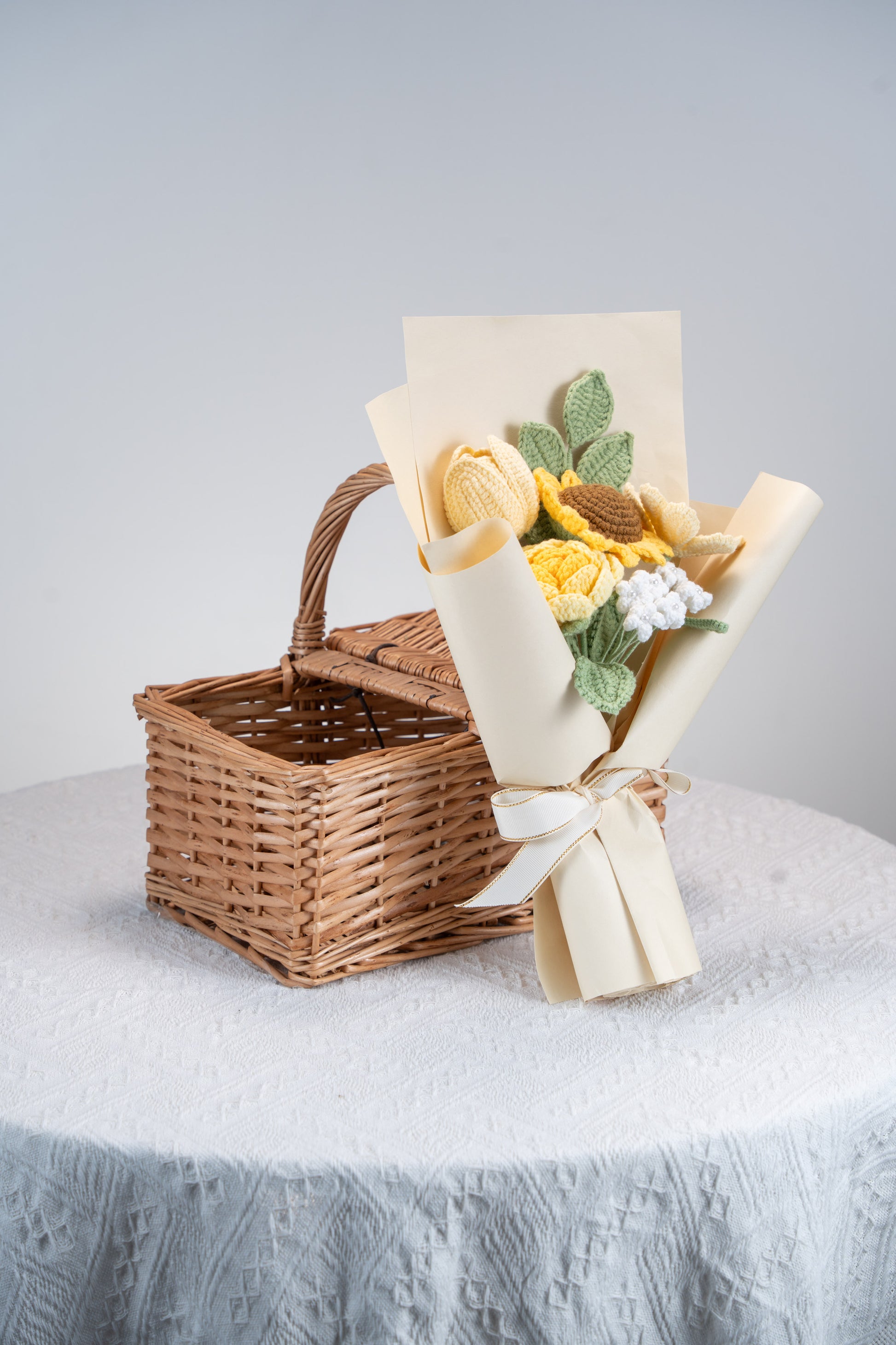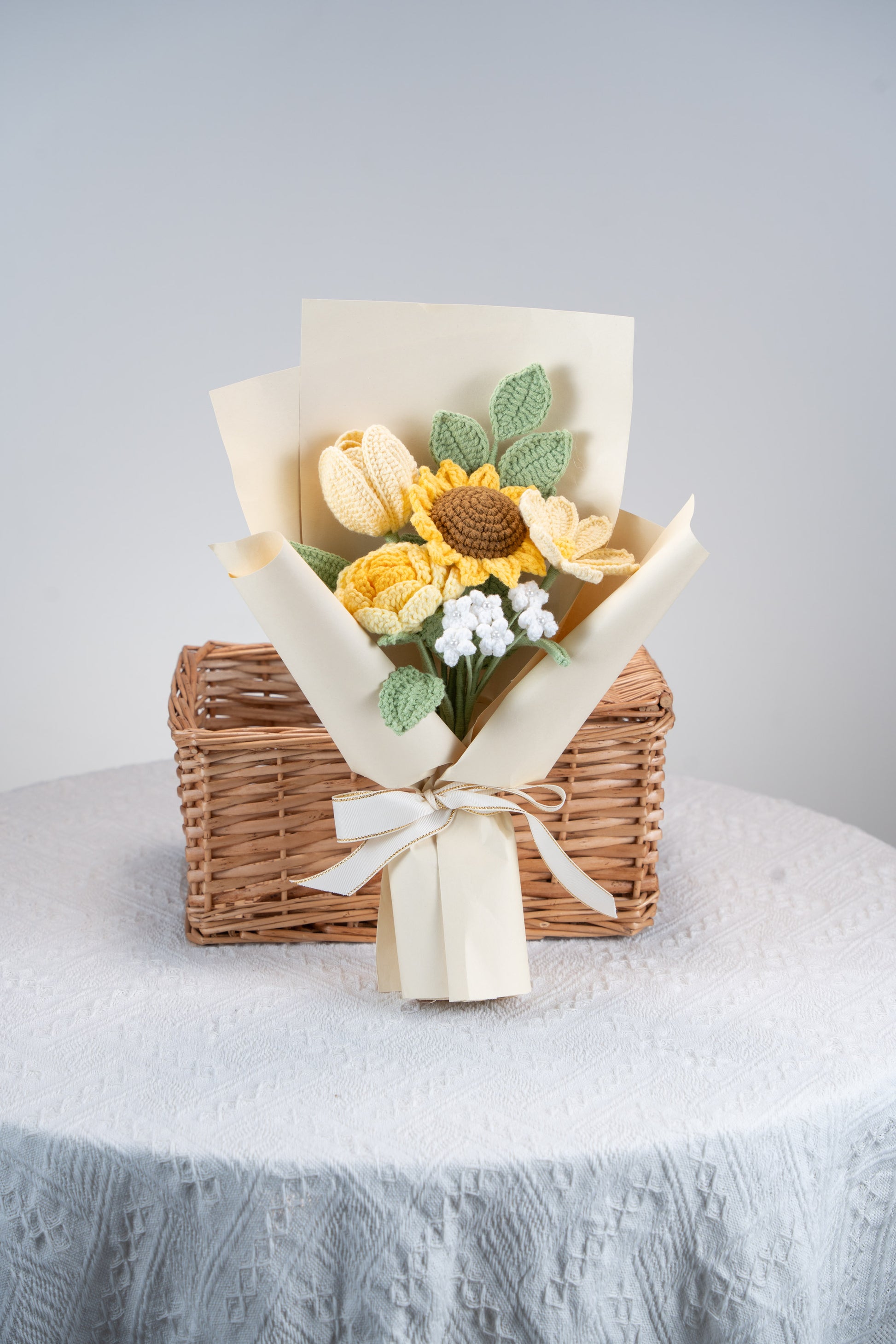 Yellow Sunflower with Cosmos Bouquet: contains: 1 sunflower, 1 Cosmos, 1 tulip, 1 rose, 1 baby's breath, 1 greenery