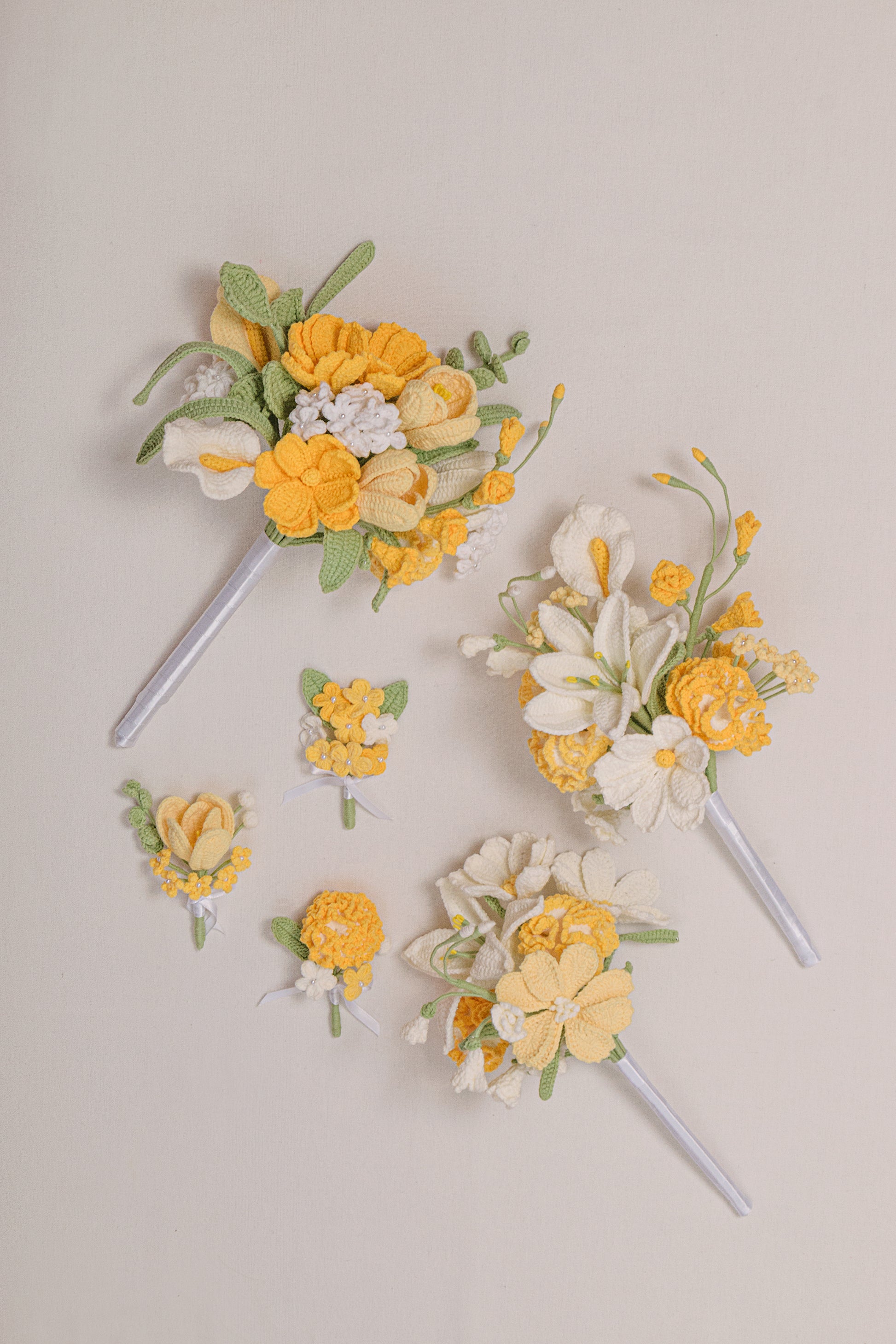 - Main flower: yellow Cosmos; white, dark and light yellow tulips